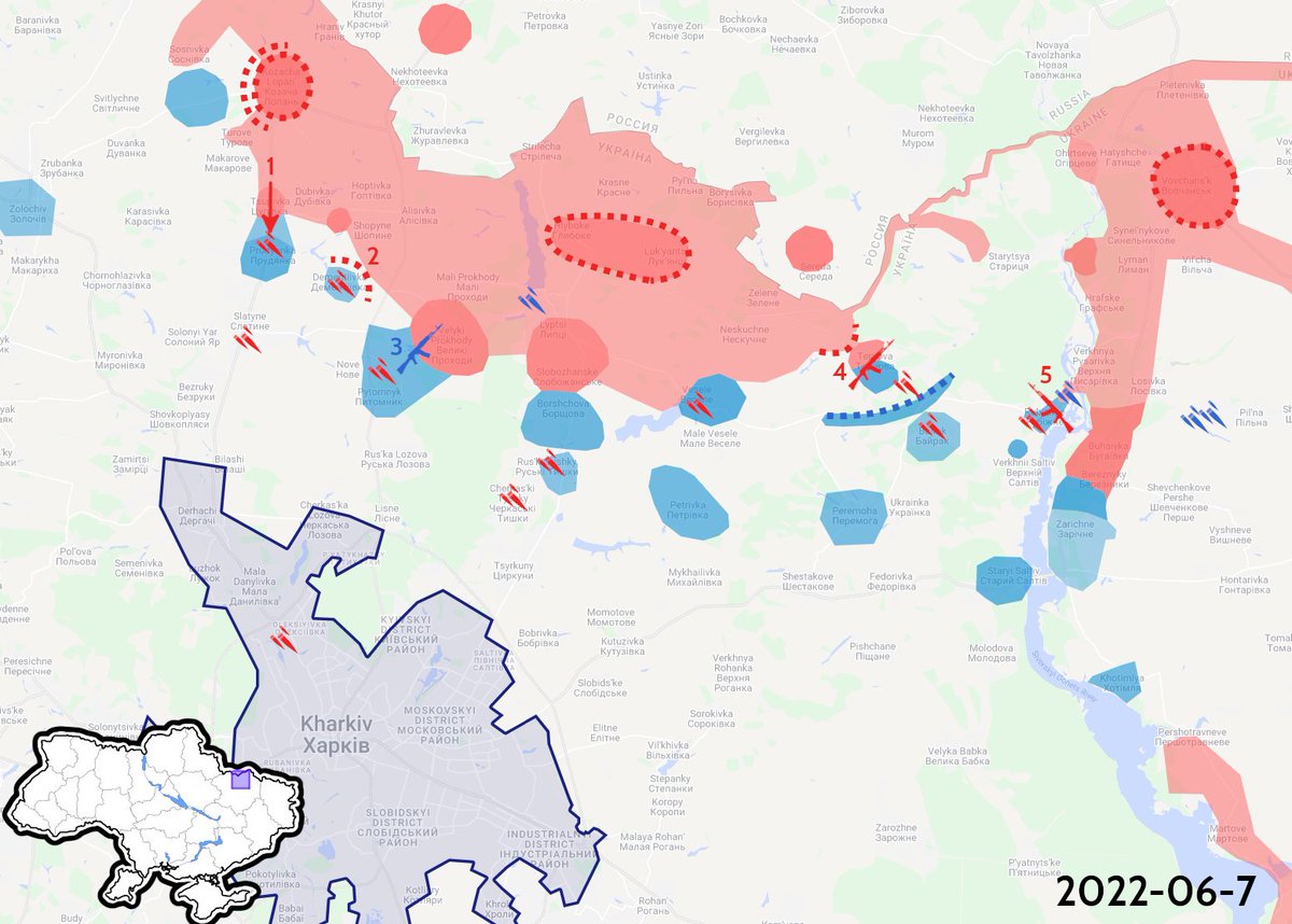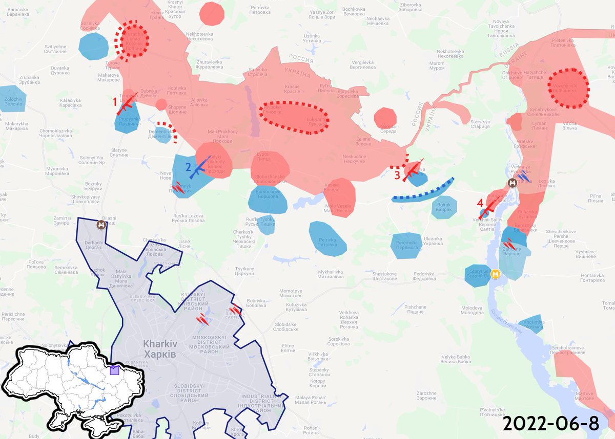 First, the Kharkiv area: The situation hasn't changed, and it remains status quo. There is fighting Tsupivka (1), Velyki Prokhody (2), Ternova (3), and Rubizhne (4).