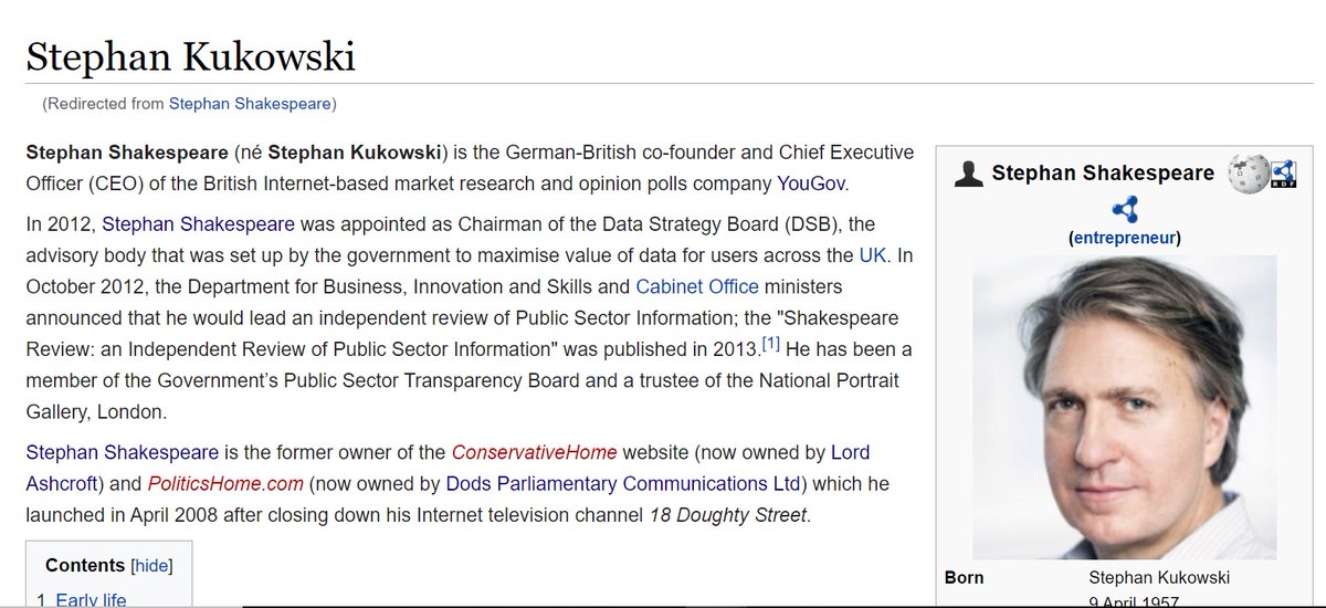 "Stephan Shakespeare was born as Stephan Kukowski in 1957 in Mönchengladbach, where his German father, a journalist, was the German Press Liaison Officer of Headquarters British Army of the Rhine. "