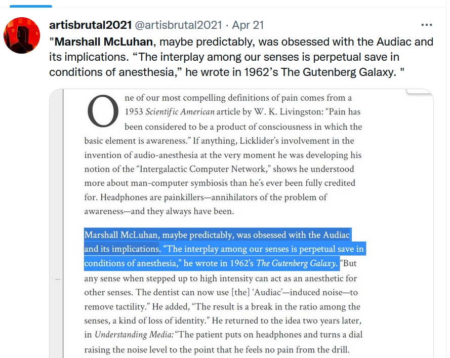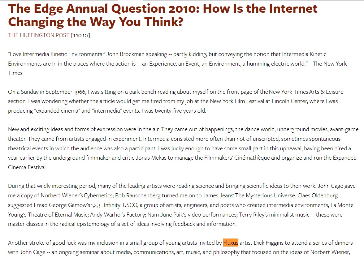 "..my inclusion in a small group of young artists invited by Fluxus artist Dick Higgins to attend a series of dinners with John Cage - an ongoing seminar .. that focused on the ideas of Norbert Wiener, Claude Shannon, and Marshall McLuhan." John Brockman edge.org/edgenews/2010?…