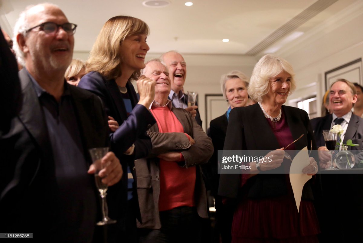 "Camilla, Duchess of Cornwall (R) with (L-R) Alan Yentob, Fiona Bruce, Jeffrey Archer and Tim Rice as she attends a reception hosted by Gyles Brandreth, President of the Oscar Wilde Society - Grosvenor House London, 2019"