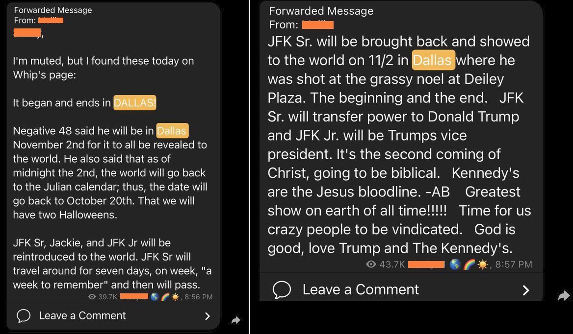 Pour ceux qui veulent en savoir plus, il s’agit pour la plupart de pro Trump qui croient les délires de quelques influenceurs #Qanon. Selon leurs théories JFK, Jackie et leur fils JFK Junior vont réapparaître et ramener Donald Trump à la Maison Blanche.