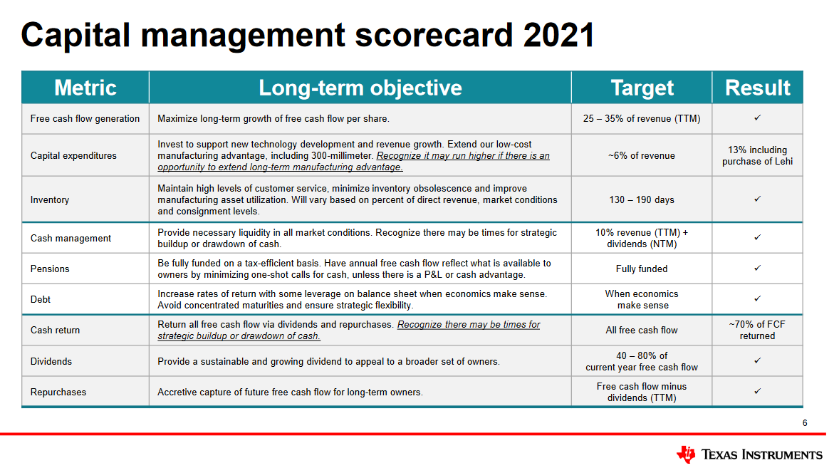 Their 2021 Capital allocation scorecard shows that they met most of their goals.