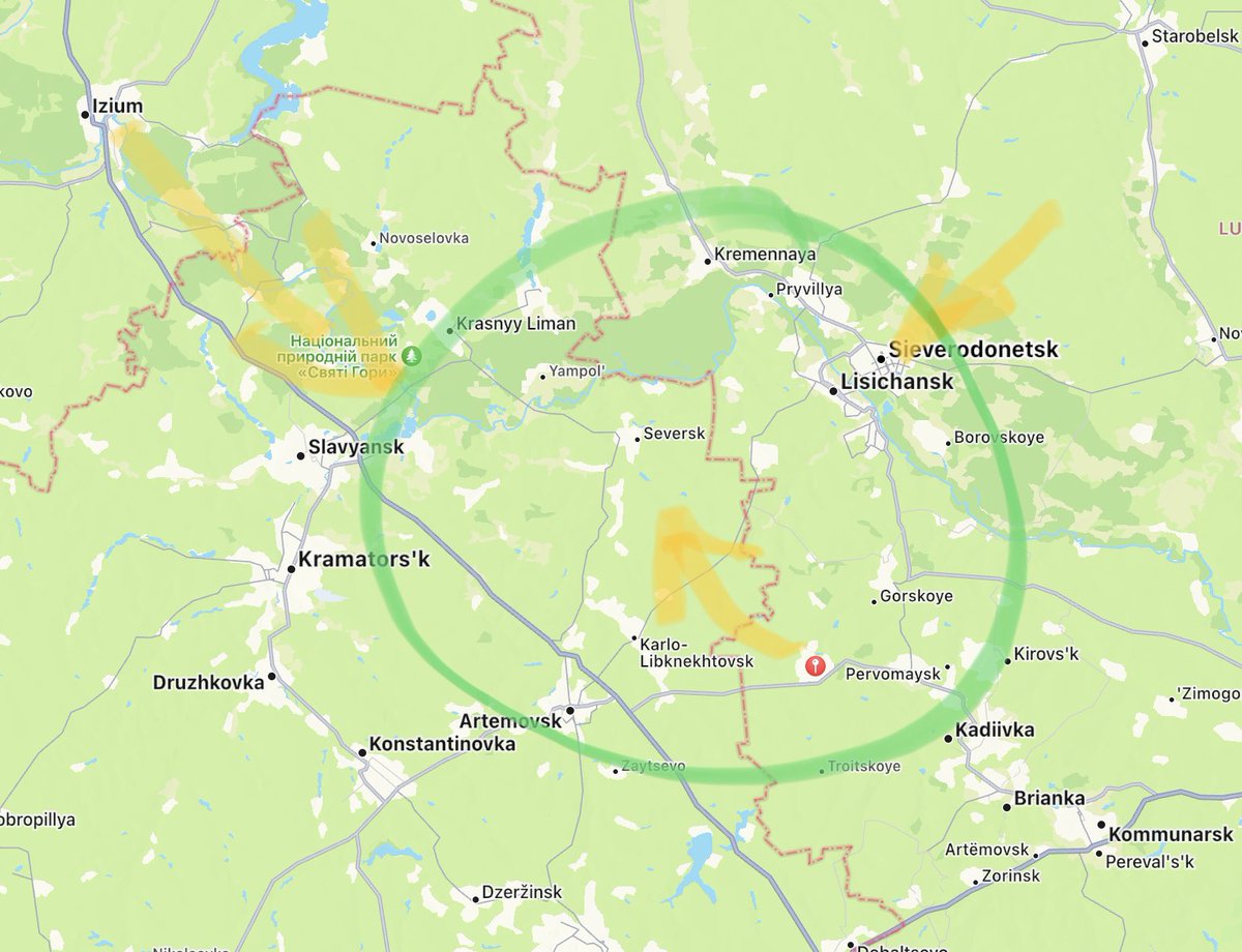 Torniamo a Severodonietsk, perchè è importante la presa di questa città ? Per due motivi: 1) è la terza testa di ponte per chiudere le truppe ucraine in una sacca con spinte da Popasana, Izyum e Severodonietsk. Non è detto che sacca si manifesti come in mia mappa artigianale