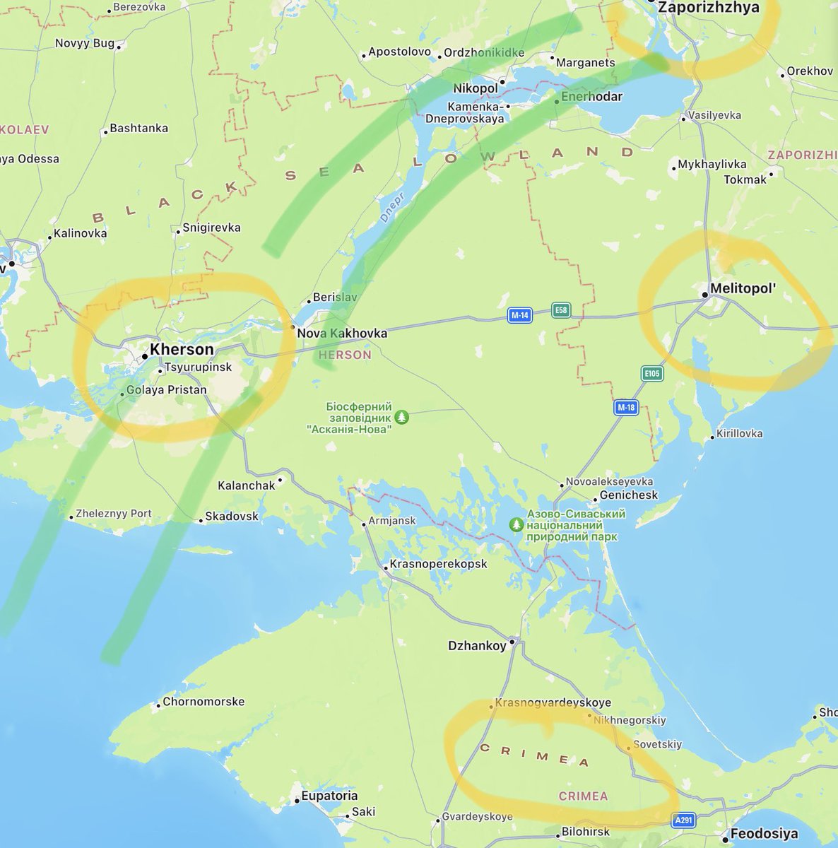 creare un cuscinetto anti-artiglieria a difesa di Melitopol e il mar d’Azof in genere 3) per consolidare la presenza sul Dnieper che rappresenta asse di penetrazione (arriva fino a Kyev) per future offensive ma soprattutto confine facilmente difendibile (sponda sinistra)