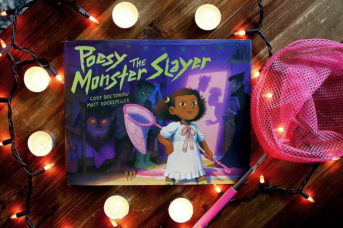 My first picture book is out! It's called Poesy the Monster Slayer and it's an epic tale of bedtime-refusal, toy-hacking and monster-hunting, illustrated by Matt @MCRockefeller. It's the monster book I dreamt of reading to my own daughter.