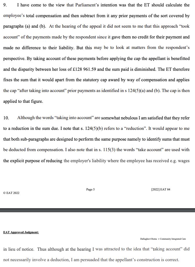 1/ Dafiaghor-Olomu v Community Integrated Care: In a case where the statutory cap applies & compensation is paid pursuant to an ET order, no credit is given for that payment as against the statutory cap is compensation is then revised upwards. #ukemplaw
