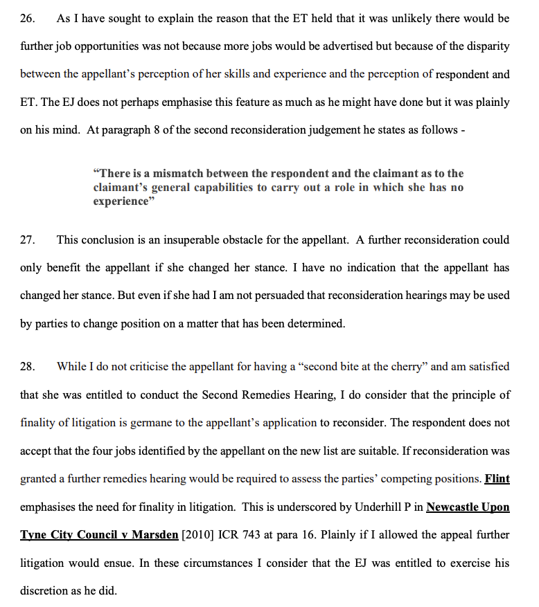 7/ The judgment also includes a pretty niche point about refusal of reconsideration where the EJ had refused to order re-engagement on the basis of D's unrealistic attitude to what jobs she was qualified for, refused to reconsider that decision & then refused a 2nd such app'n.