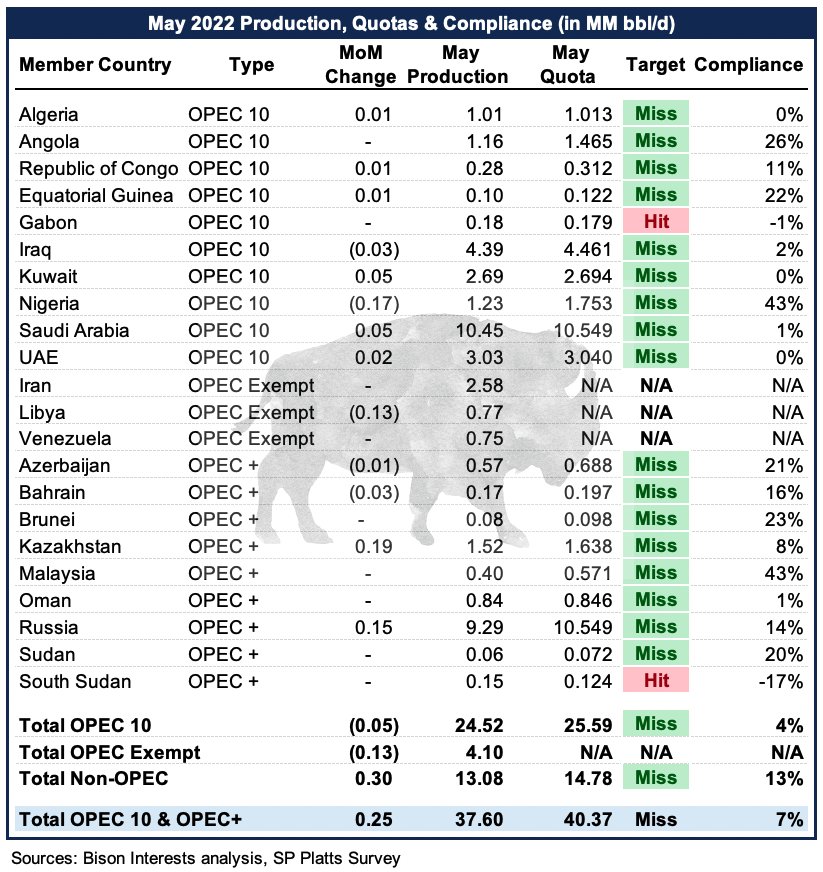 17/19 OPEC+ countries (excluding the exempt) missed their production quotas, the highest number of misses ever since we started sharing comments on this.