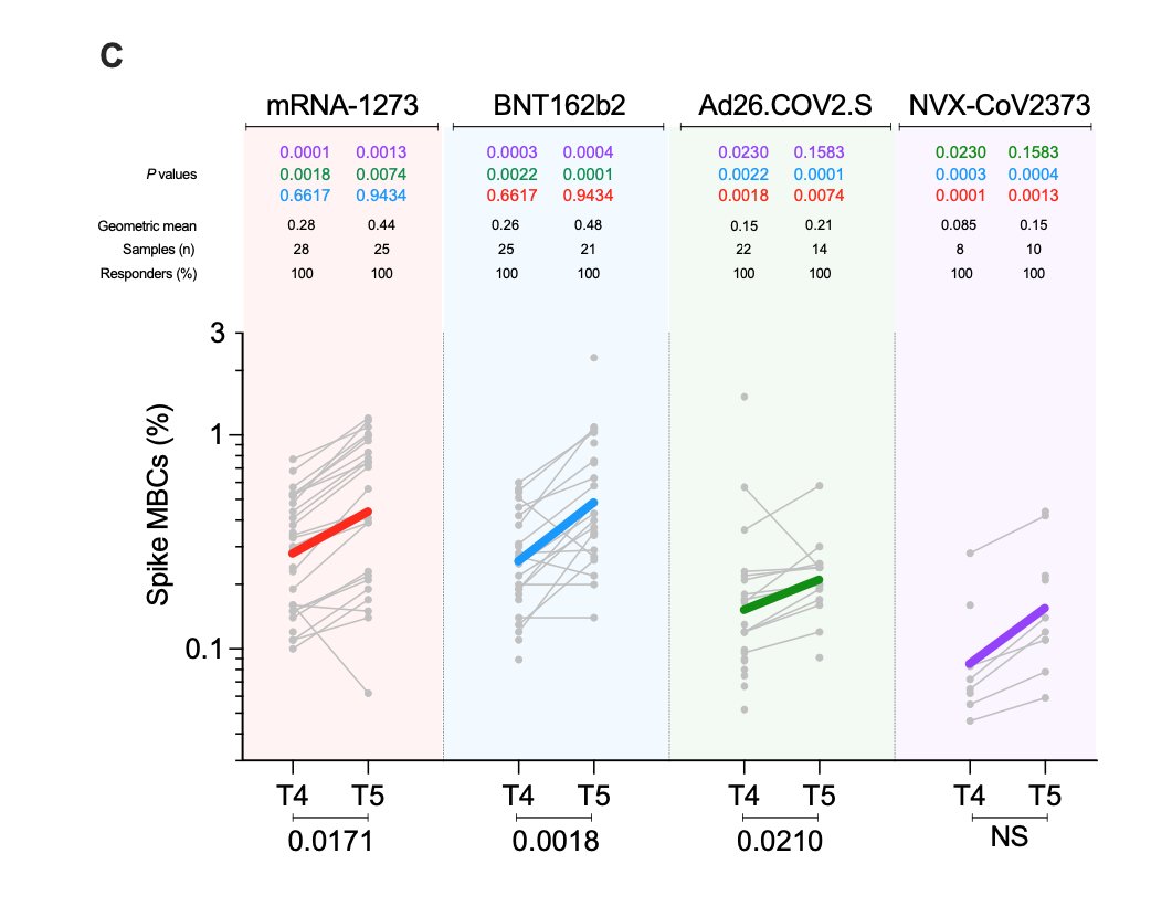 3/ Zum ersten mal wurden auch B-Gedächtniszellen nach 4 verschiedenen Vakzinen untersucht und verglichen (sind wichtiger als reine Ak-Titer, da sie bei Infx zur schnellen Neuproduktion von Ak führen). Hierbei Zunahme bis 6 Mo post Vakz. Moderna und BNT etwa gleich und > J&J > NVX