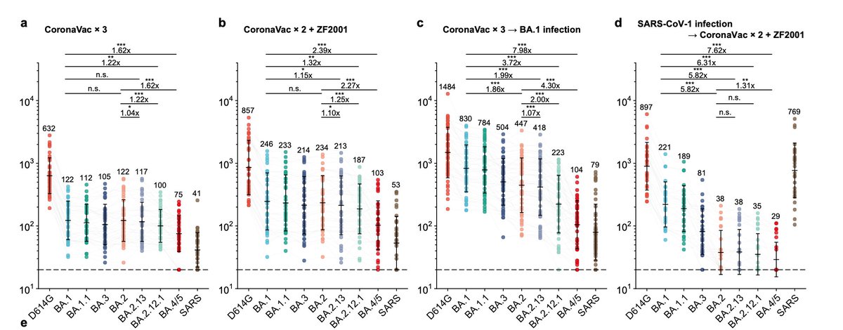 2/ ...Geimpften genauso ausgeprägt wie bei Geimpften und Infizierten. In der aktuellen Studie ist die Neutralisationskapazität gegenüber BA.4 und 5 nochmals um das 3 fache reduziert (bei Geimpften und BA.1 Infizierten). Wenn dieser Abfall auch hier bei Geimpften genauso ➡️