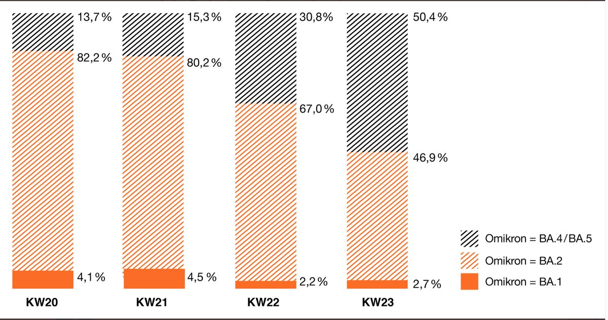 1/ BA.4/5 dürften in D mittlerweile nicht nur relativ dominant sein, sondern auch die absoluten Fallzahlen steigen wieder (offizielle 7-Tages-Inzidenz nach RKI 14.6. ca 450) und das obwohl immer weniger getestet wird. Noch bedenkenswerter ist folgendes: