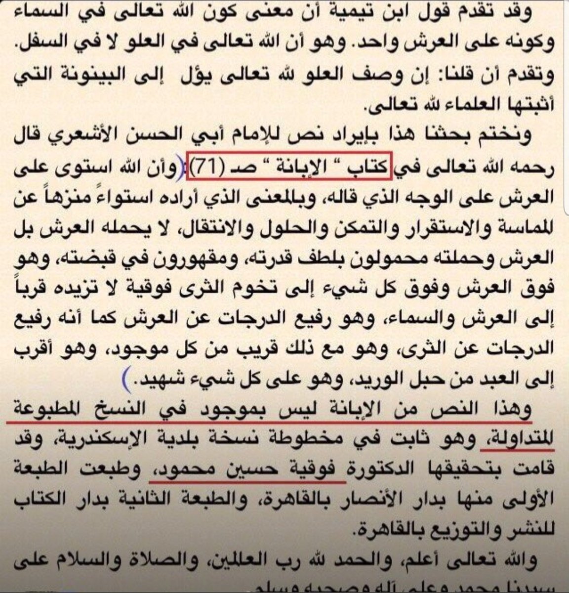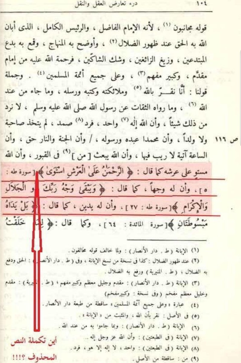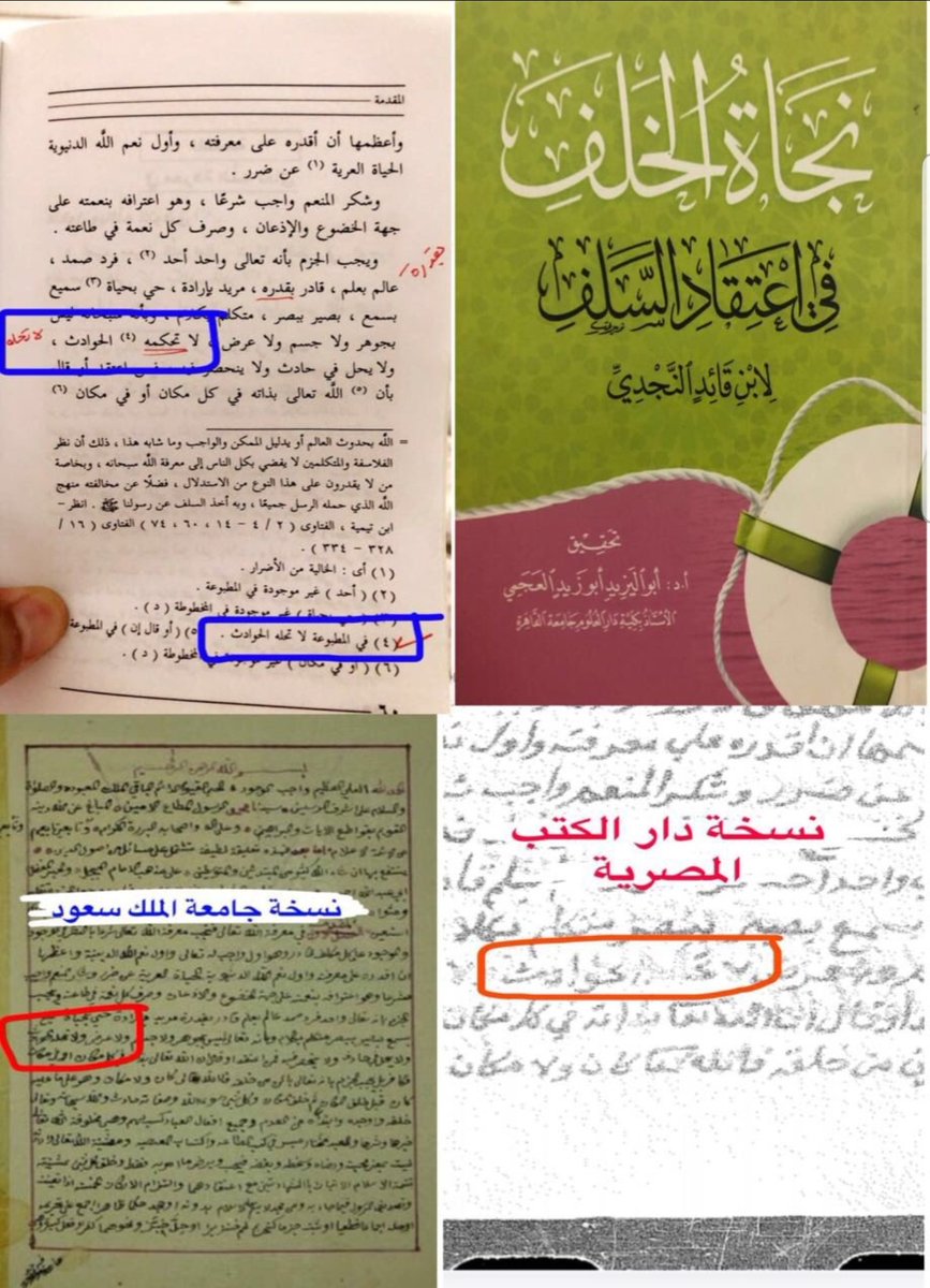 هذا الكتاب طبع قبل٣٥عامًا قام محققه وهو من جماعة #التوحيد_الانتقائي بتحريف عجيب فرارًا من نفي حلول الحوادث بالله فأثبت عبارة لا نعرف طائفة تقولها فجعل مكان (لا تحله) عبارة (لا تحكمه) مخالفًا جميع النسخ التي اعتمدها،