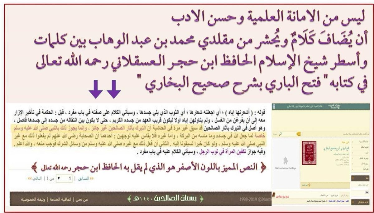 ليس من الامانة العلمية وحسن الادب ان يضاف كلام ويحشر من مقلدي محمد بن عبد الوهاب بين كلمات واسطر شيخ الاسلام ابن حجر العسقلاني في كتابه فتح الباري