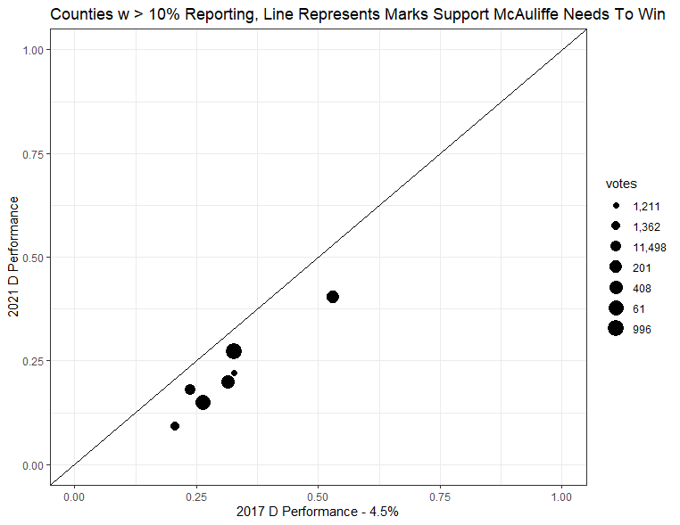 I've done these before and they are a handy way to see what the votes mean. Basically, once counties clear a certain number of votes in, this take them and compares them to 2017 results, with 4.5% taken off the 2017 results (since Northam won by 9). 1/