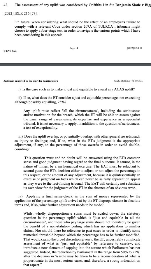 1/ Rentplus UK v Coulson: Another HHJ Tayler judgment to keep in your "Essential case law" folder. Almost everything you need to know about the s.207A TULR(C)A uplift in 1 neat, concise judgment. assets.publishing.service.gov.uk/media/62907f52… #ukemplaw