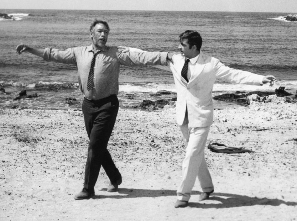 Вот эта сцена. Куинн (с бородкой) рассказывал, что накануне съёмок сломал ногу, поэтому импровизируя, волочил её по песку, стараясь не переносить вес на травмированную конечность. Так появились фирменные движения сиртаки, танец ещё называют Zorba dance — по имени героя Куинна.
