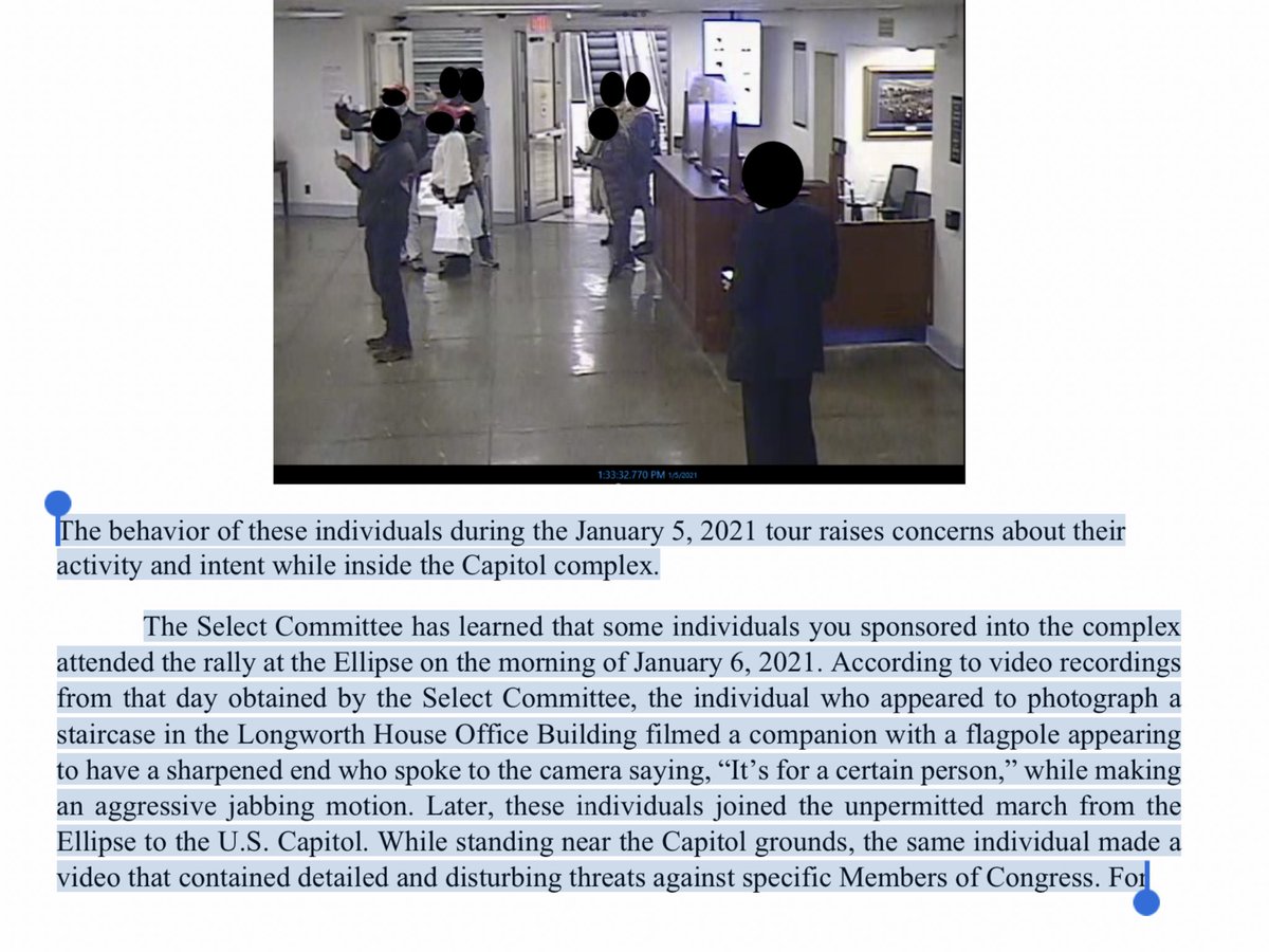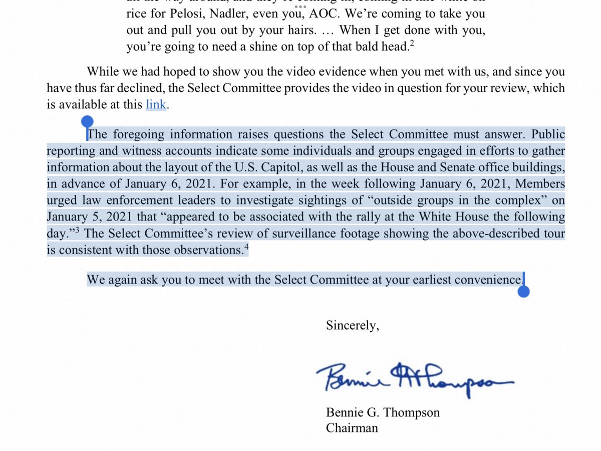 “The foregoing information raises questions the Select Committee must answer. … … We again ask you to meet with the Select Committee at your earliest convenience.” letter ends