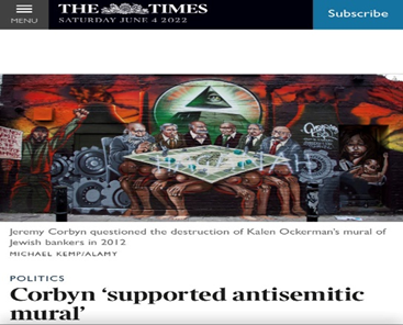 En 2018 Jeremy Corbyn reprend des scories de la haine antijuive prolétarienne détestant le riche:il s’oppose publiquement à la destruction d’une fresque murale rappelant les clichés antisémites des années 30 et les illustrations du Juif Süss,diffusées à satiété sous le IIIe Reich
