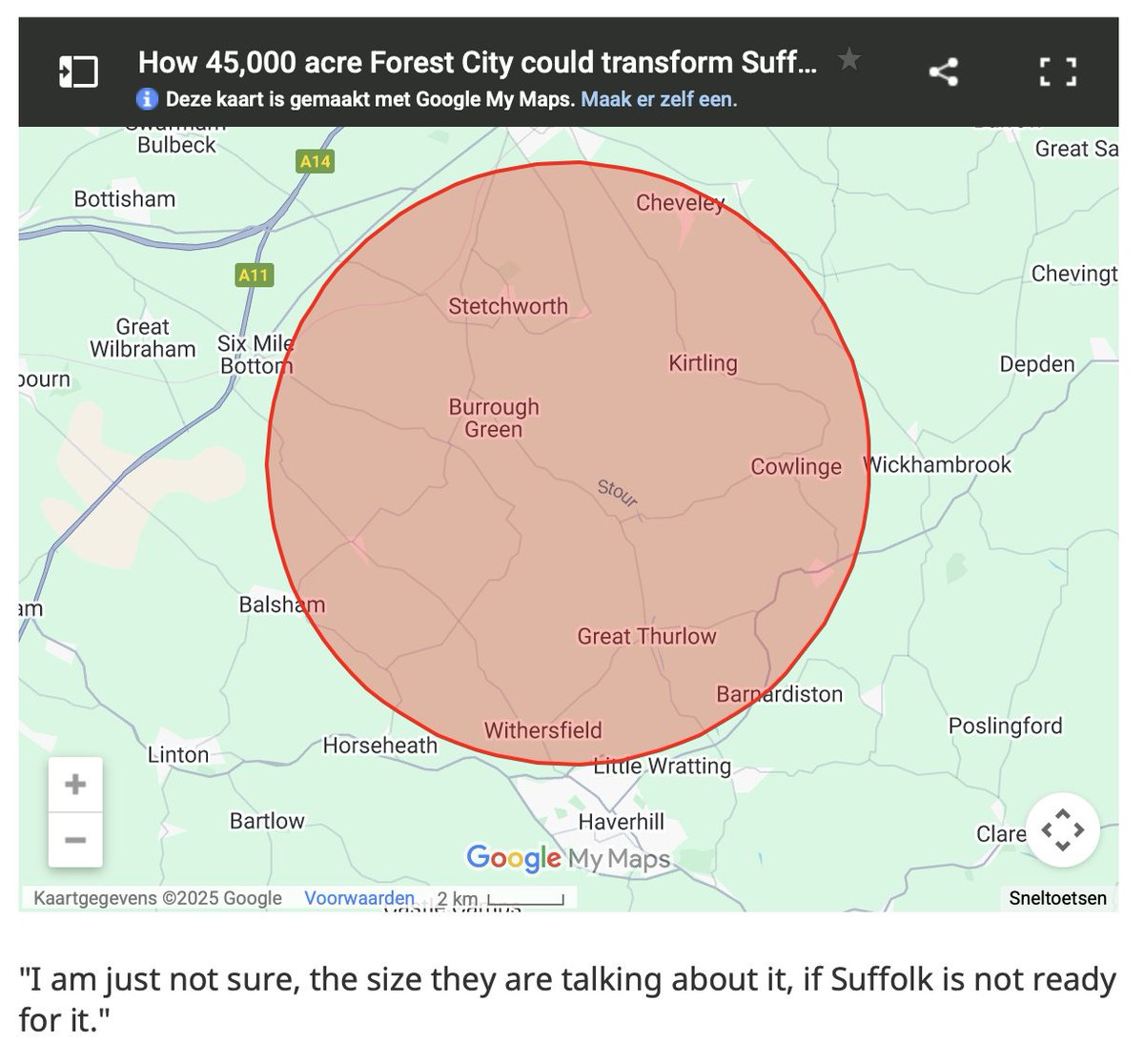 Forest City, positioned near the A14 between Haverhill and Newmarket, would occupy approximately 182 square km (45,000 acres) — roughly 4.8% of Suffolk's total land area — right in the heart of this existing SEZ infrastructure.