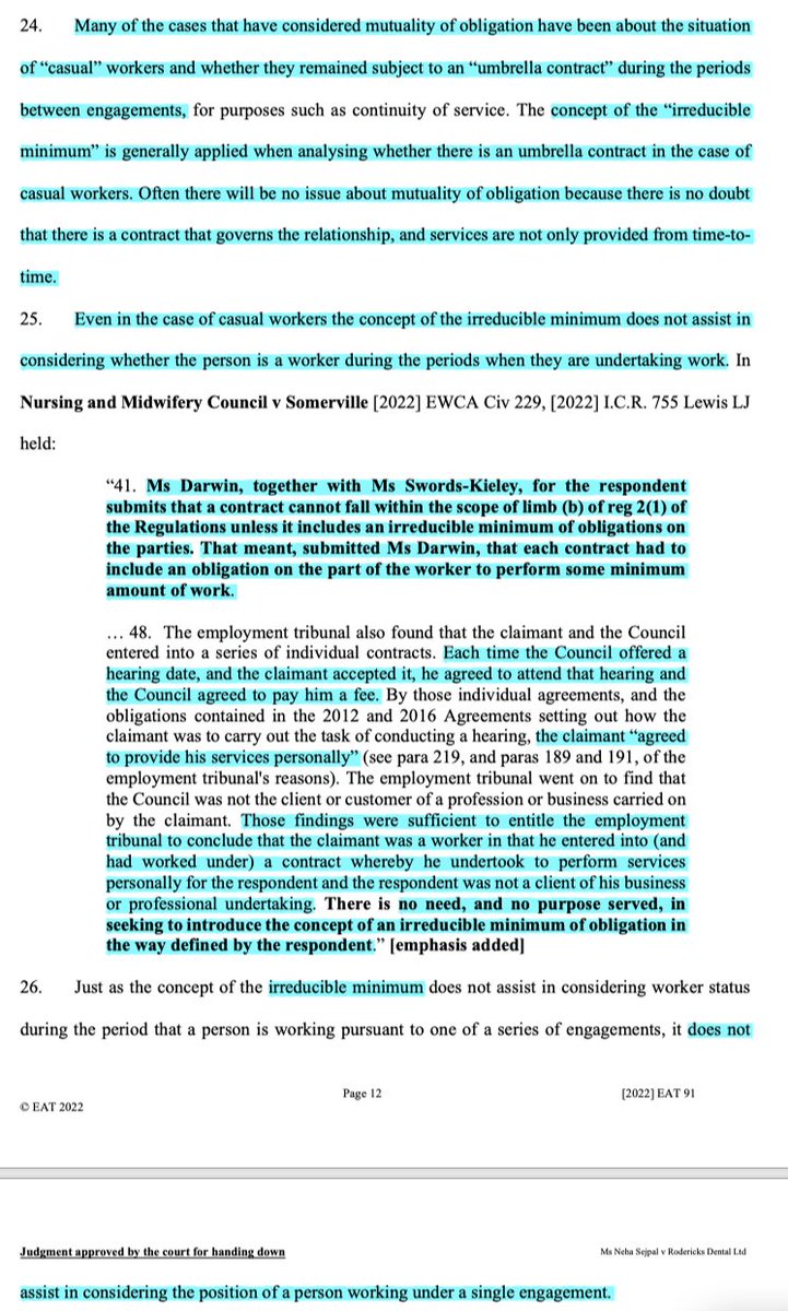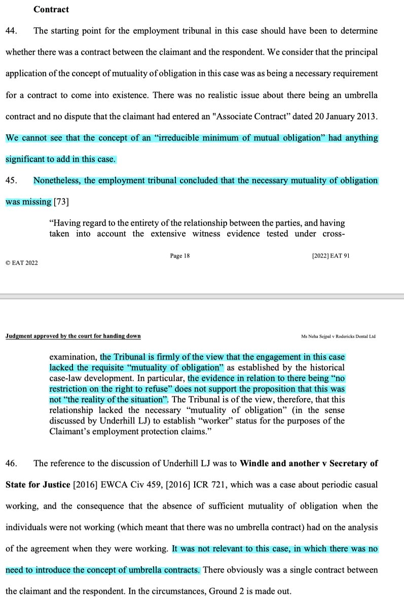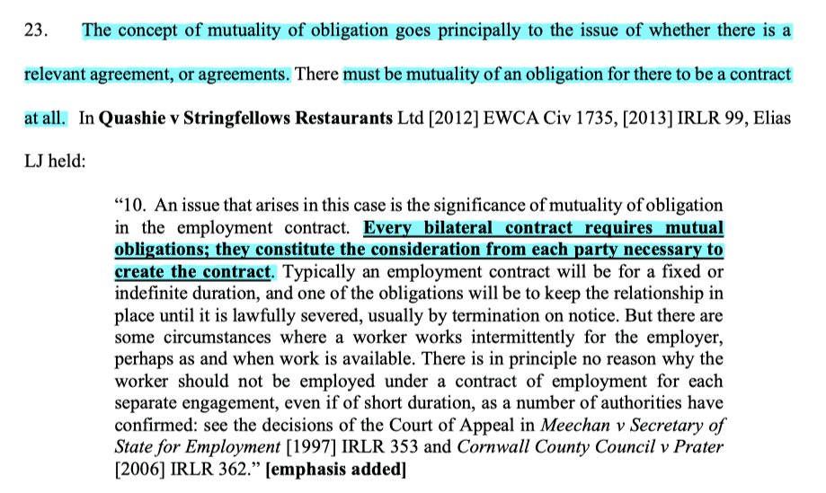 8/ Next, the EAT considers mutuality of obligation, noting that in reality it's a tool of pretty limited utility save when trying to determine if there's an umbrella contract (usually for continuous service purposes). When actually working, it's not a tool of assistance.