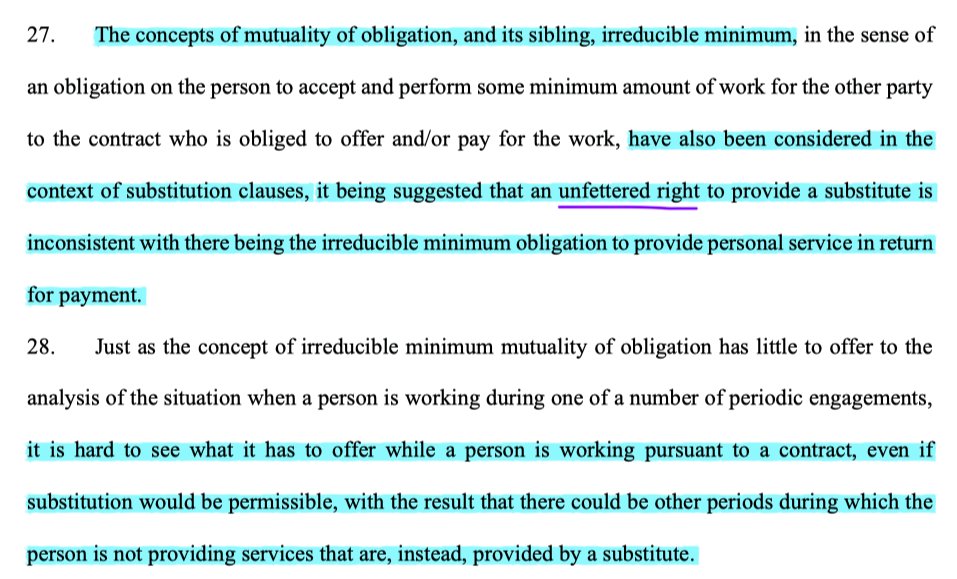 9/ It's here that things start to get interesting. The EAT disavows the argument that the irreducible minimum of obligation is the basis for finding an unfettered right to substitution to be inconsistent with worker status: why should it do so when the person is actually at work?