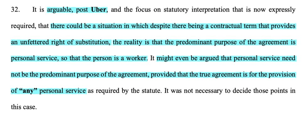 11/ It's the throwing of an understated hand grenade into #ukemplaw. Should it really be the case that because a clever lawyer has provided for an unfettered right to substitute, that's the end of the worker status argument? Does that go against the statute's protective purpose?