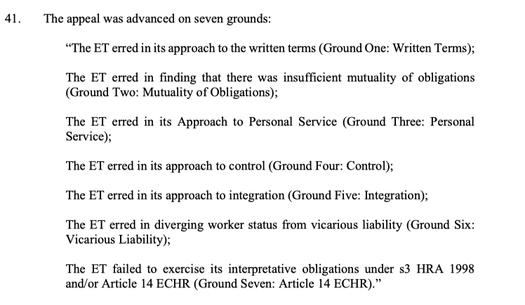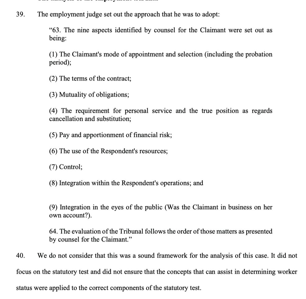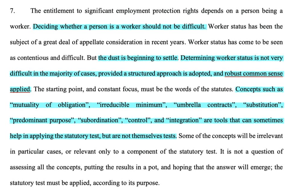 5/ The EAT judgment starts with an incredibly helpful analysis of the law on worker status, which includes some points which will be trite & mundane, and a couple which will surprise & doubtless be analysed in future appeals.