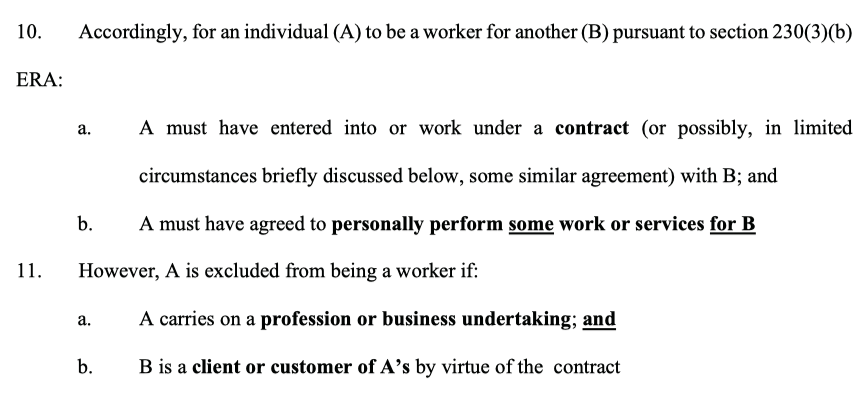 7/ The judgment moves from there to setting out the statutory wording, the familiar 3 categories of Bates van Winkelhof, & what Autoclenz & Uber have to say about how to determine the true nature of the agreement. This will all be familiar stuff.