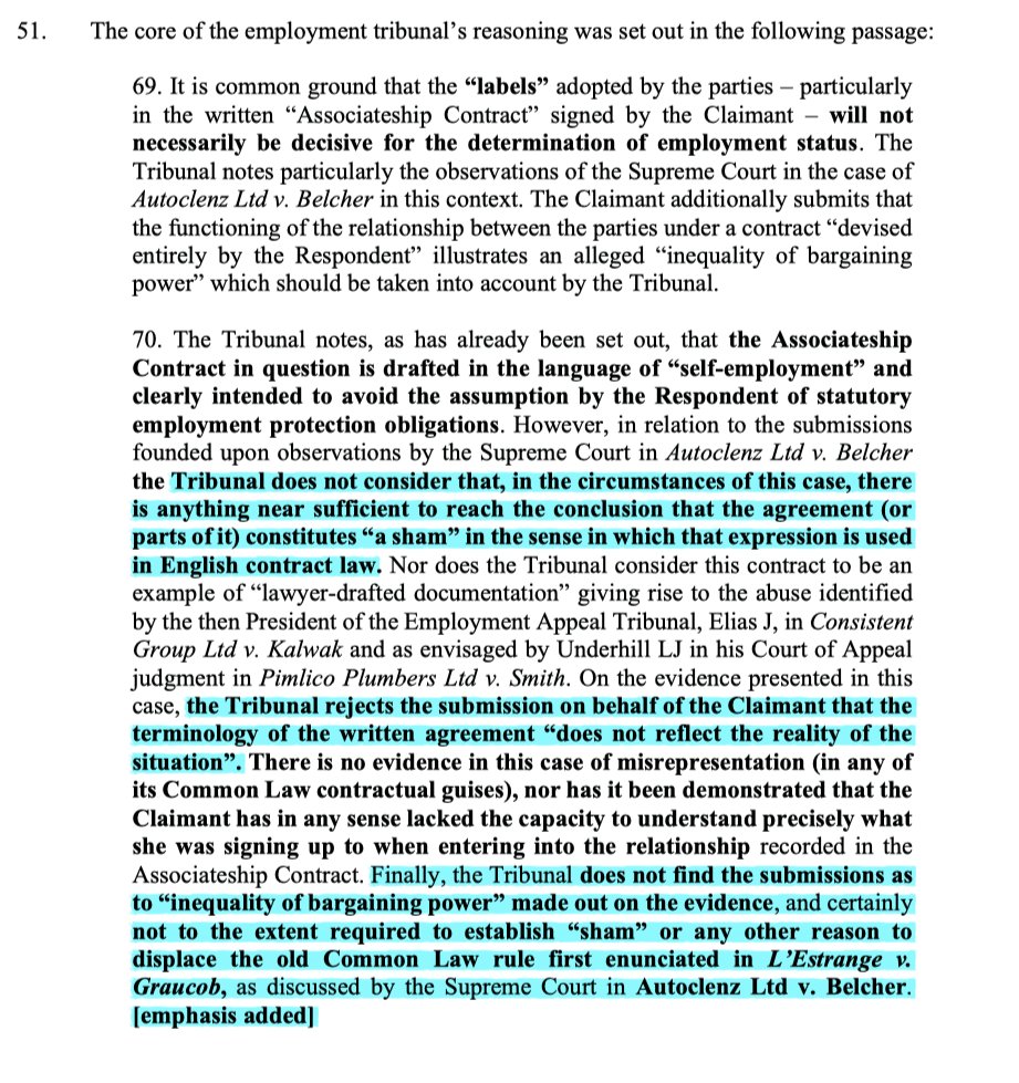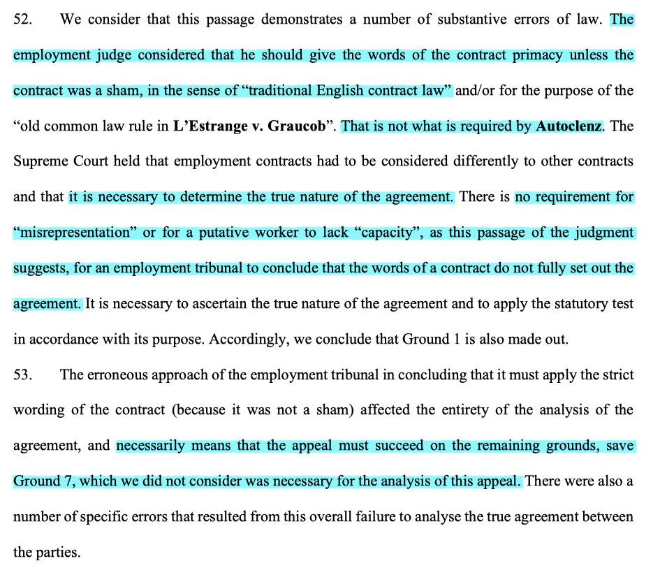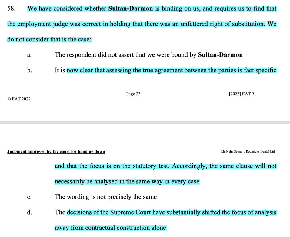 18/ The EAT found it wasn't bound by Sultan-Darmon. The clause not identical, but also Autoclenz & Uber had shifted focus from the contractual wording alone, & assessments of the agreement are fact specific so even an identical wording may be viewed differently in other cases.