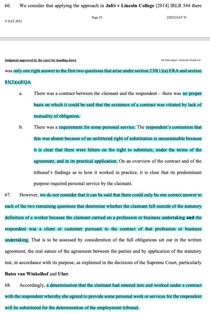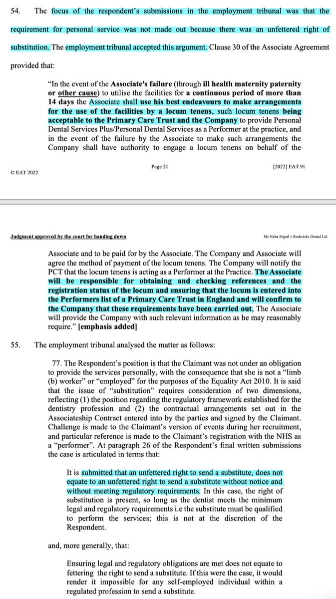 1/ Sejpal v Rodericks Dental Ltd: a must-read case in which the EAT finds the worker status test is very simple, & then throws hand grenades under the reliance on an unfettered right of substitution as a way of denying worker status. caselaw.nationalarchives.gov.uk/eat/2022/91 #ukemplaw