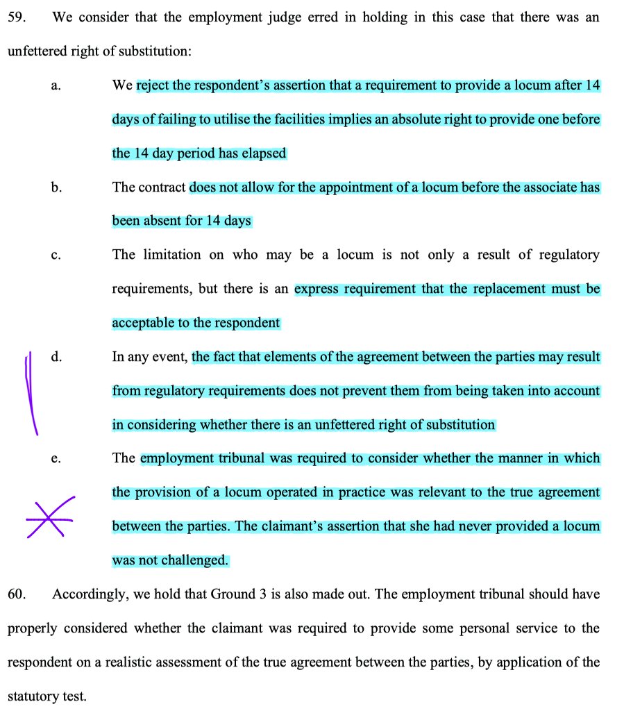22/ In short, the EAT clearly doesn't like the way in which a contractual right for unfettered substitution has been used to undermine what would otherwise be worker rights, & has provided ammunition for all angles of attack against it.