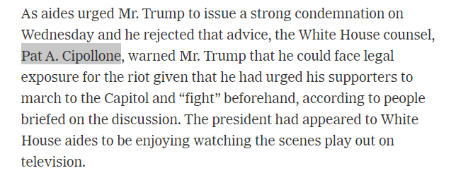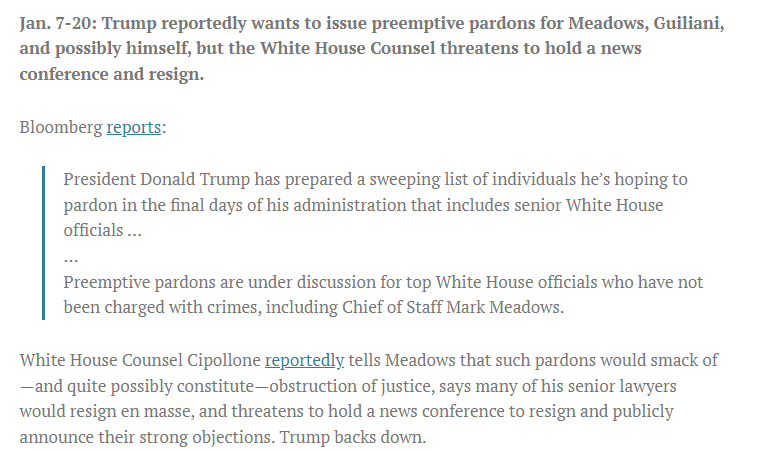 2/ When Trump considered issuing preemptive pardons for Meadows, Giuliani, and himself, Cipollone reportedly warned that could constitute obstruction of justice.