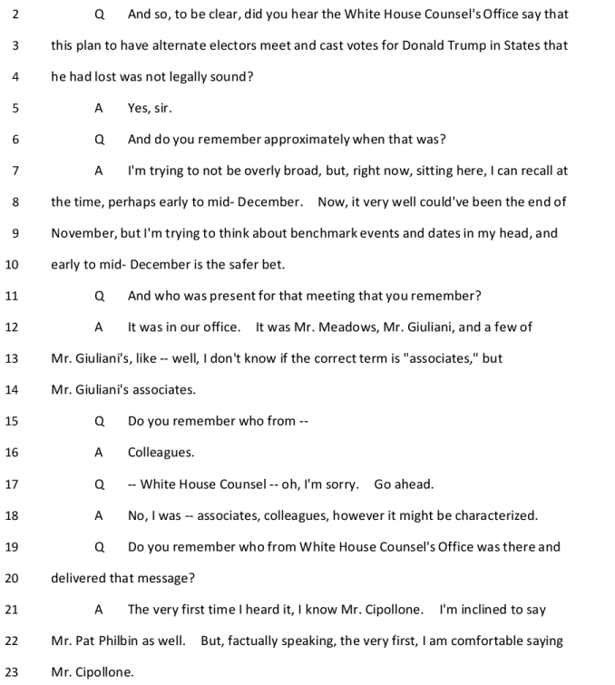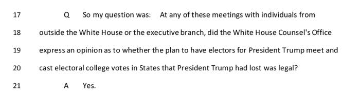 White House Counsel's Office warned Meadows, Giuliani, "Giuliani associates," and some Republican members of Congress that the alternate slate of electors scheme was legally invalid.