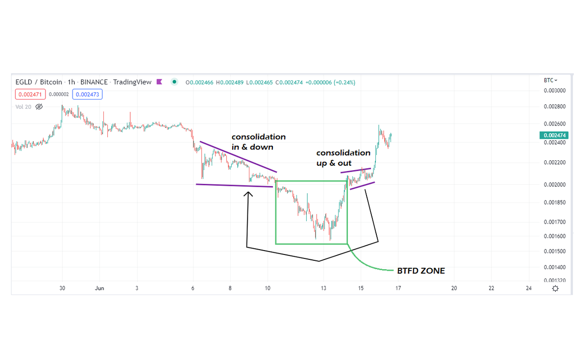 10/ $EGLD / $BTC - This is exactly the formation we like to see. Support breaks β consolidation in downtrend β CAPITULATION β recovery β consolidation up & out at previous point of consolidation/break down β further growth post-consolidation.