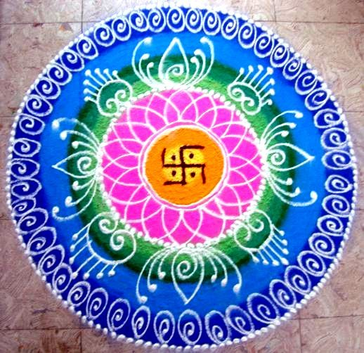 Rangoli, also known as Kolam or Muggu in south india, is a folk art in India in which patterns are created on the floor in or outside houses using materials such as rice flour, powder colors, white rock powder,