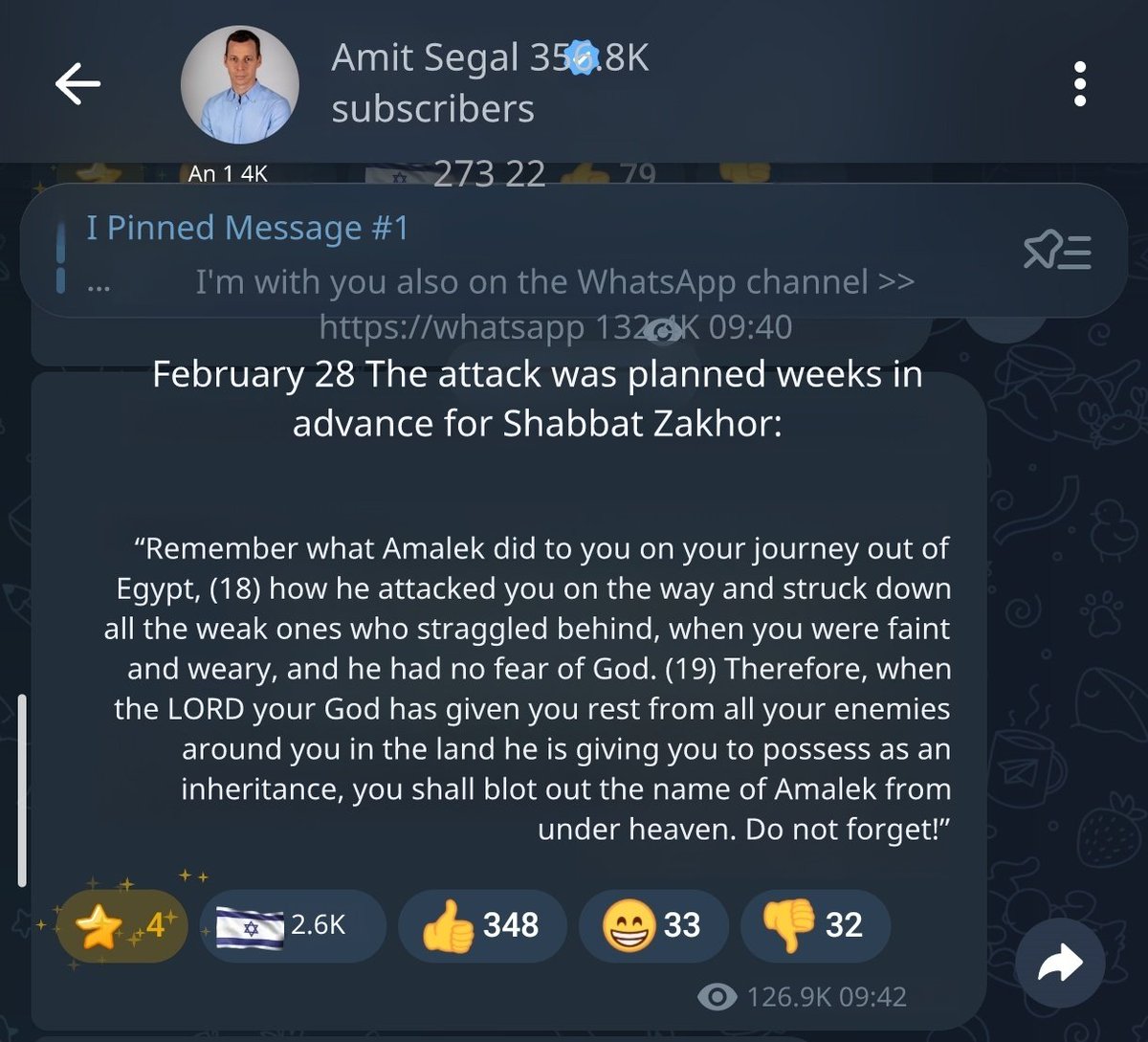 Channel 12's Netanyahu's mouthpiece Amit Segal reveals that the attack was planned weeks in advance for "Shabbat Zachor", the last Shabbat before Purim, when Jews are commanded to remember Amalek and blot-out its name.