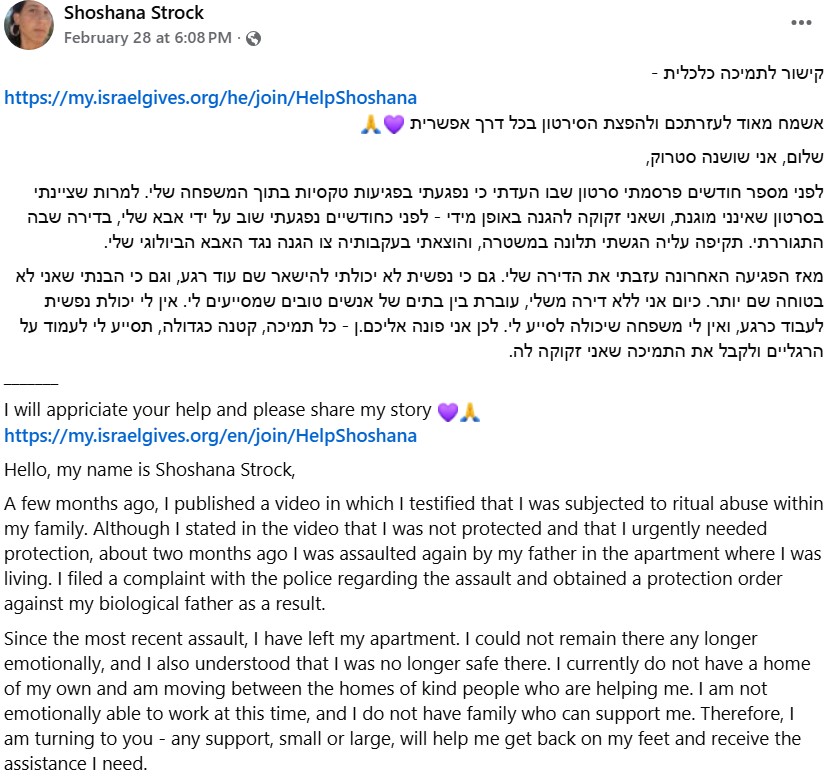 "I grew up in the Jewish settlement of Hebron. Starting from age 2.5, my parents took to my to pedophile rituals, in which I've been programmed, trained using drugs, hypnosis, sexual abuse... When I was 13 my father started pimping me out in Tel Aviv, made money off my back. The abuse continued until a much older age... What happened now is that even though I've already published it and told my story, my father keeps hurting me. He came to my apartment (two weeks ago) and abused me again. He brought another person with him, who he is training to be my next handler after my father dies... Since the last assault I left my apartment and I have no home."