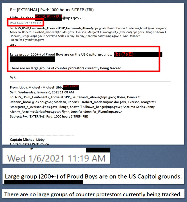 While the Proud Boys were having their lunch, at 12:36 PM, another alert went out: "There are approximately 300 Proud Boys at the Capitol". It would have reached many - it went to the inter-agency National Crisis Coordination Center. 14/