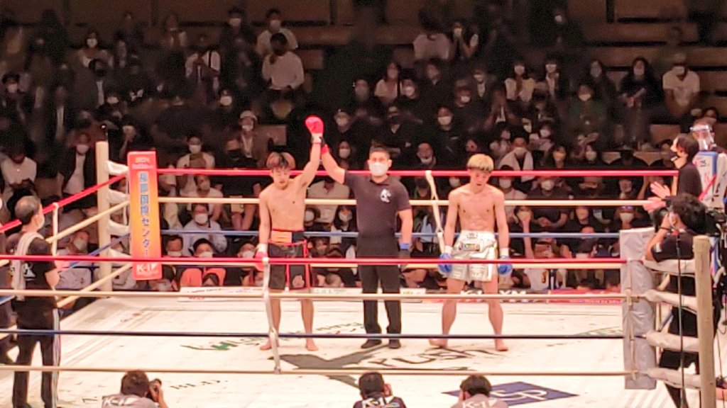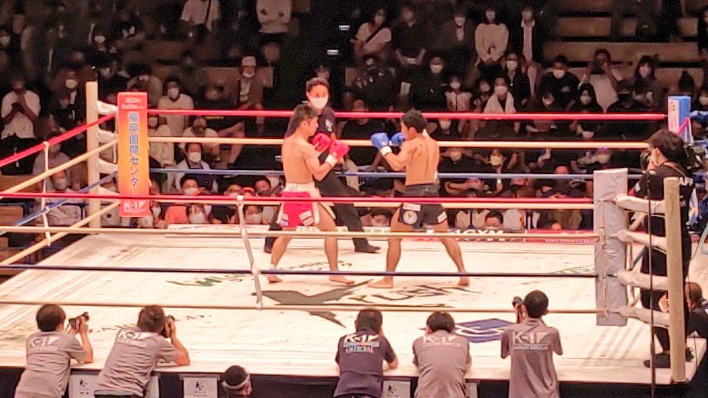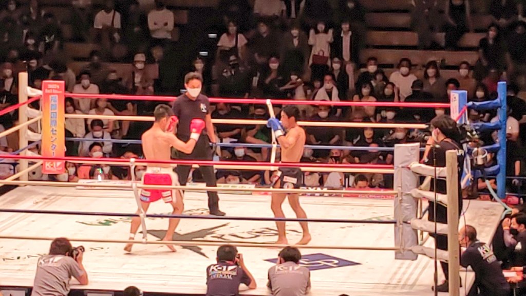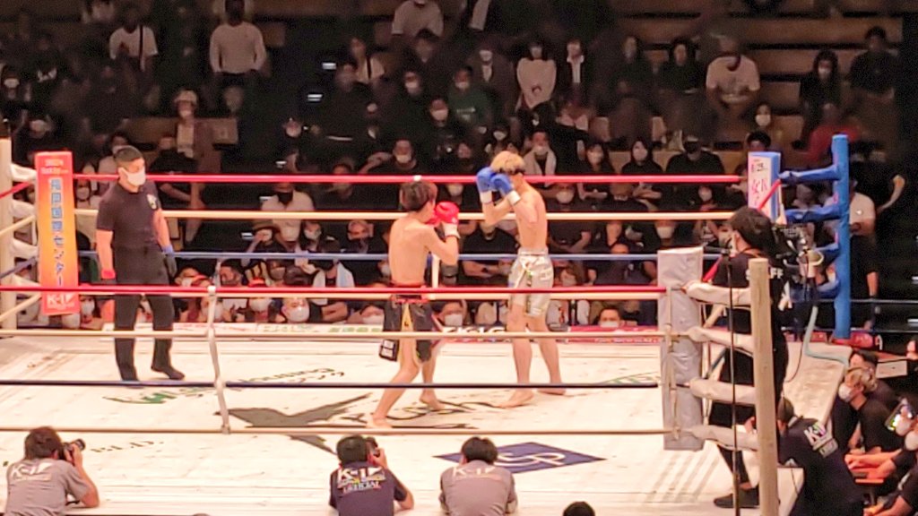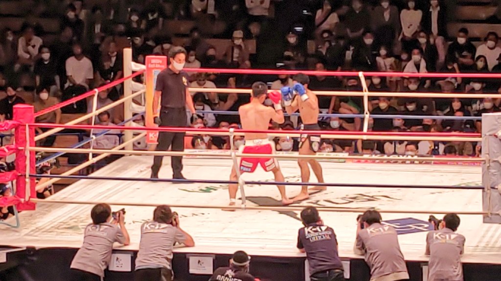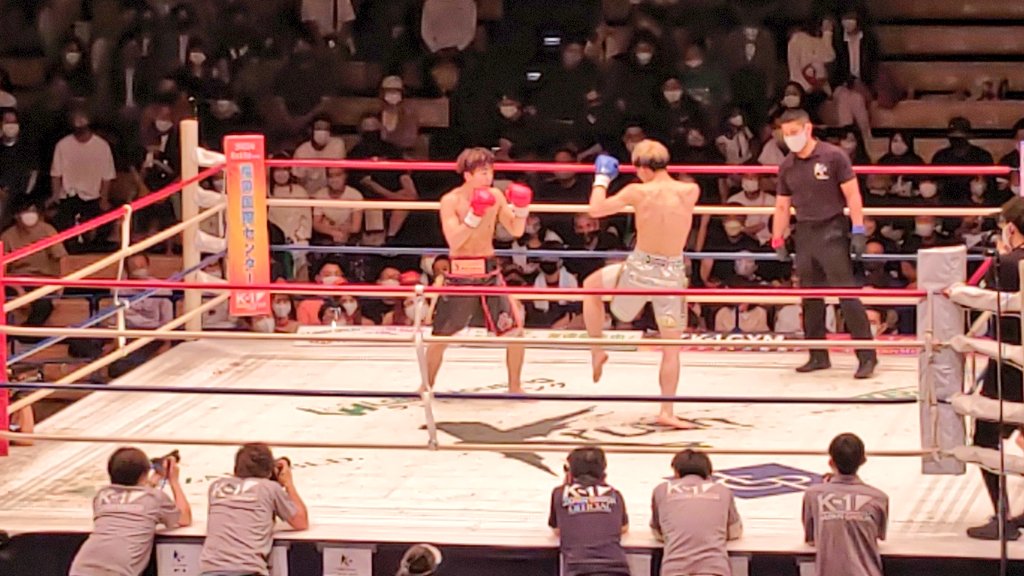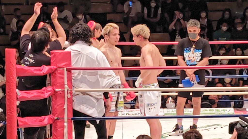 Krush第六試合はSフェザー級3分3R+延長3分1R、優弥道場の目黒翔大vsTEAM TOP ZEROS/LARA TOKYOの松山勇汰。身体の小さい目黒が猪突猛進、1Rから常に前に出て強烈なプレッシャーをかけてワンツーとボディを連打。一昨年のK-1甲子園の60kg級で優勝している松山だが、捌ききれずに何度も詰められ苦戦。