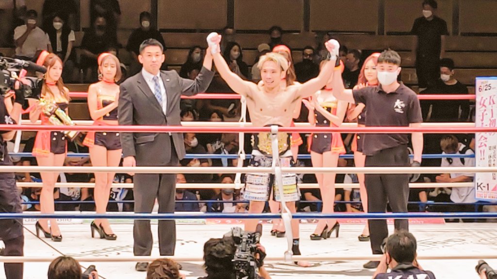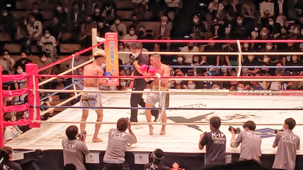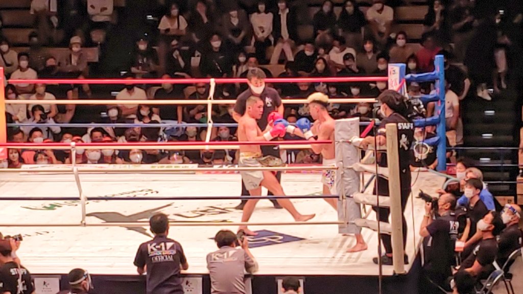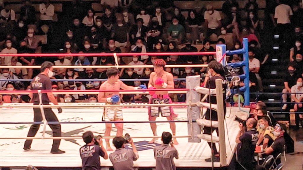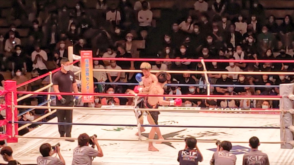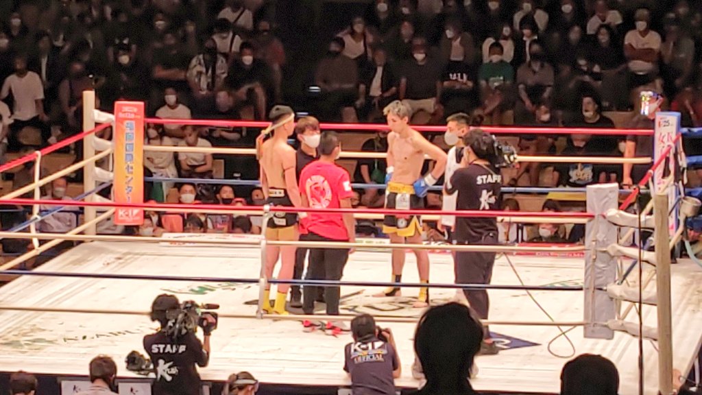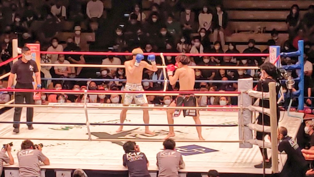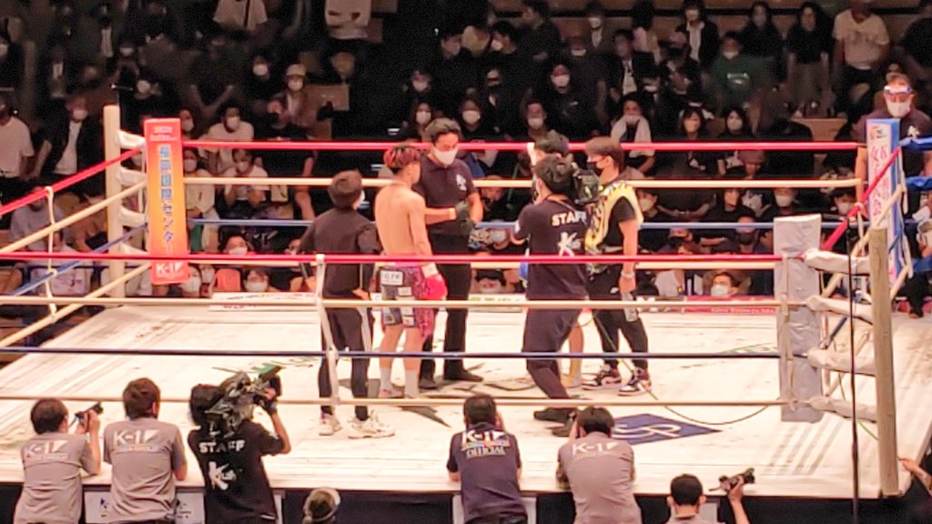 Krush第六試合はSフェザー級3分3R+延長3分1R、優弥道場の目黒翔大vsTEAM TOP ZEROS/LARA TOKYOの松山勇汰。身体の小さい目黒が猪突猛進、1Rから常に前に出て強烈なプレッシャーをかけてワンツーとボディを連打。一昨年のK-1甲子園の60kg級で優勝している松山だが、捌ききれずに何度も詰められ苦戦。