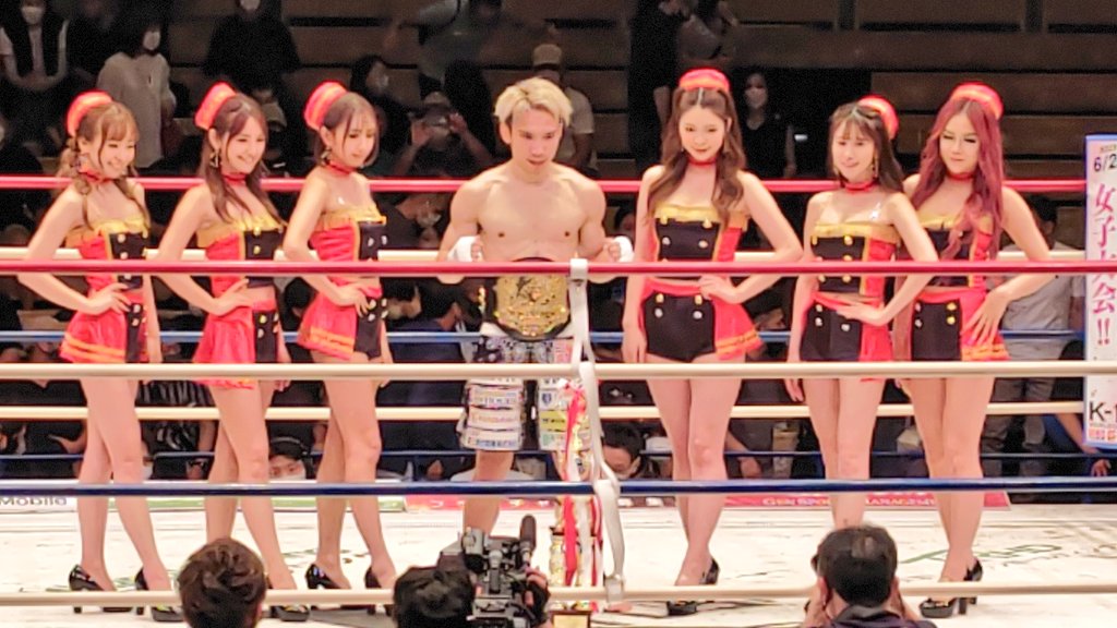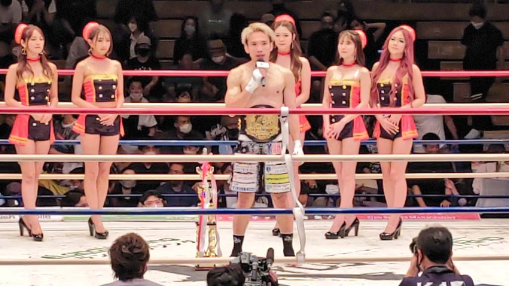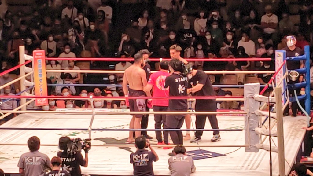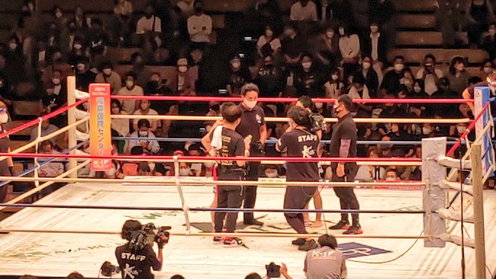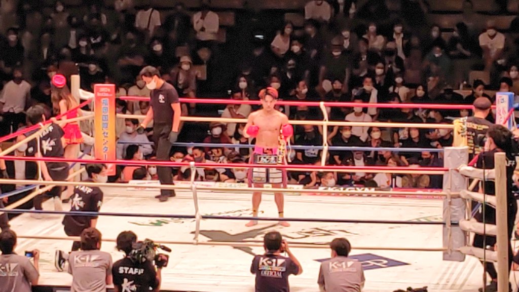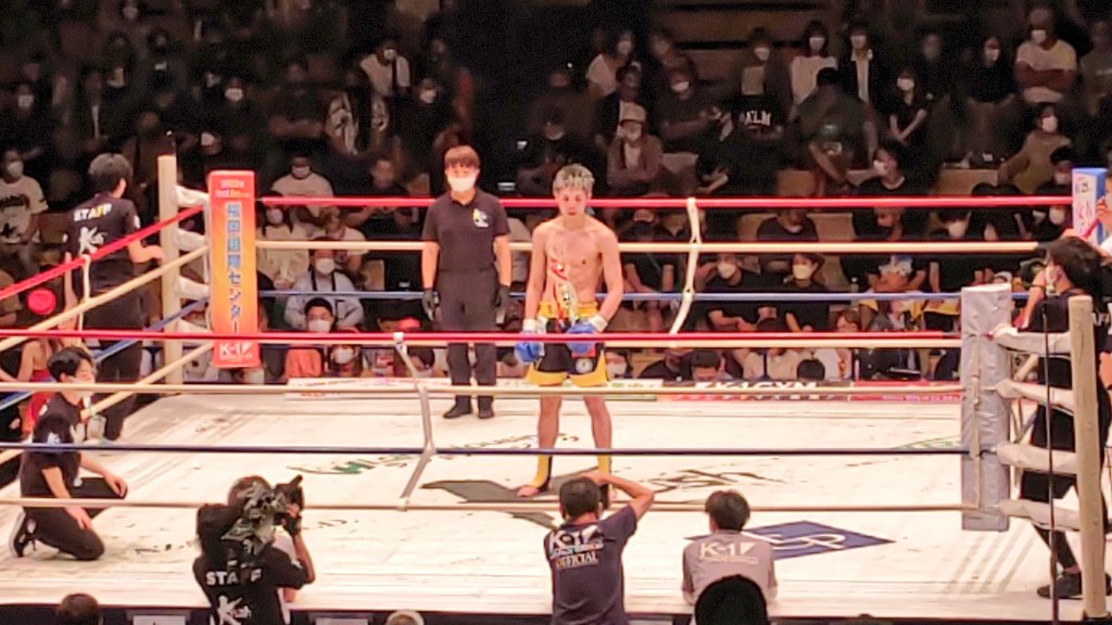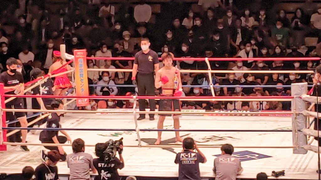 Krush第六試合はSフェザー級3分3R+延長3分1R、優弥道場の目黒翔大vsTEAM TOP ZEROS/LARA TOKYOの松山勇汰。身体の小さい目黒が猪突猛進、1Rから常に前に出て強烈なプレッシャーをかけてワンツーとボディを連打。一昨年のK-1甲子園の60kg級で優勝している松山だが、捌ききれずに何度も詰められ苦戦。