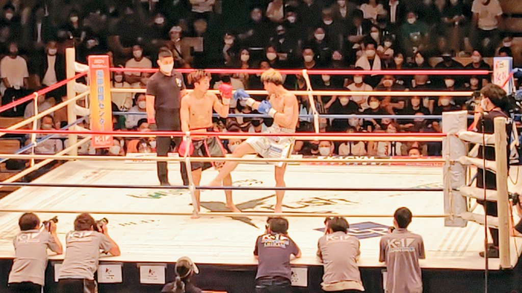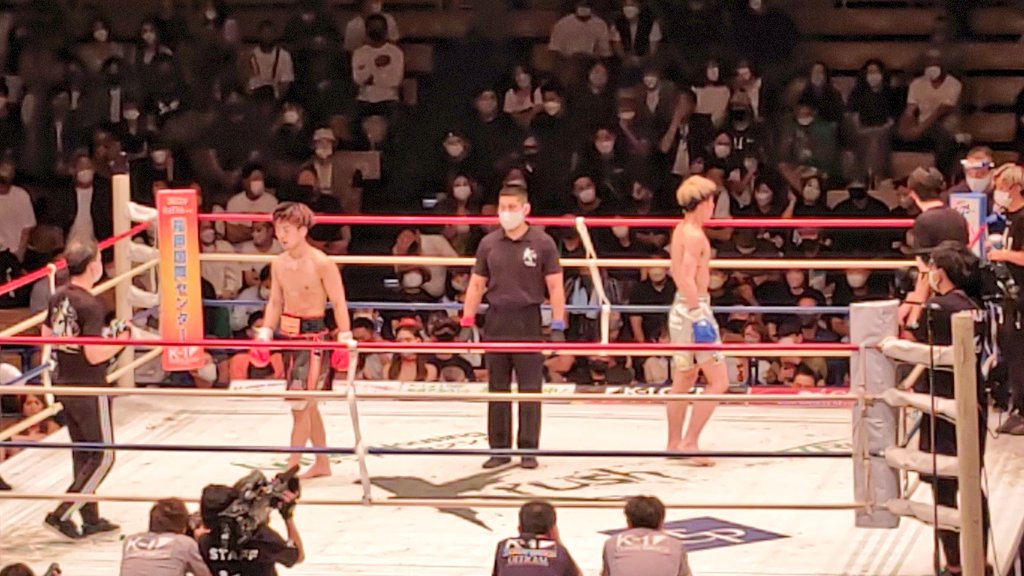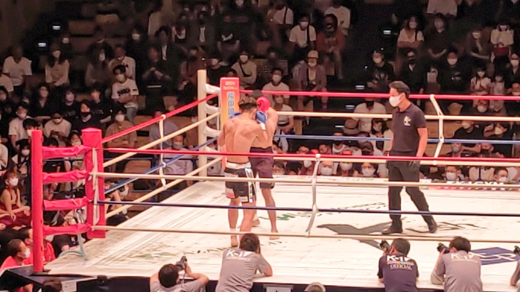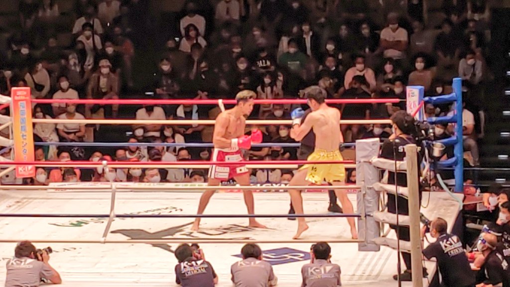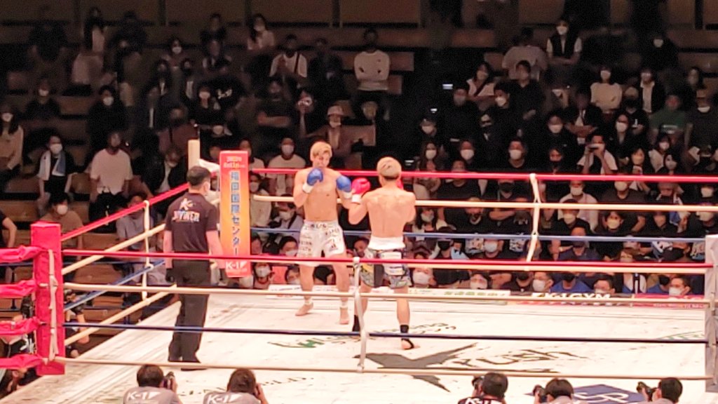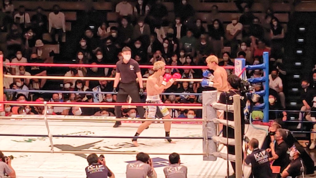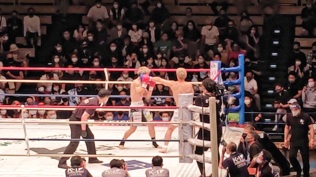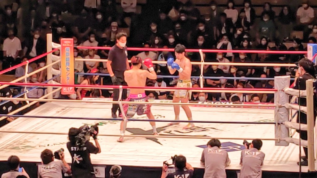 Krush第八試合Sフェザー級3分3R+延長3分1R、PURGE TOKYOの野田哲司vs team ALL-WINの松本涼雅。共に前戦で敗れてからの再起戦、1R、小刻みにリズムを刻みプレッシャーを掛ける野田、ベタ足で迎え撃つ松本。見合う場面が多い中、野田は前に出てワンツーと右ローを放ち、松本はそこへ左フックを被せる。