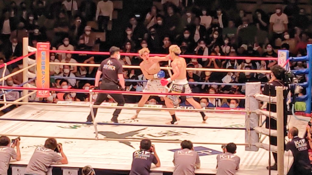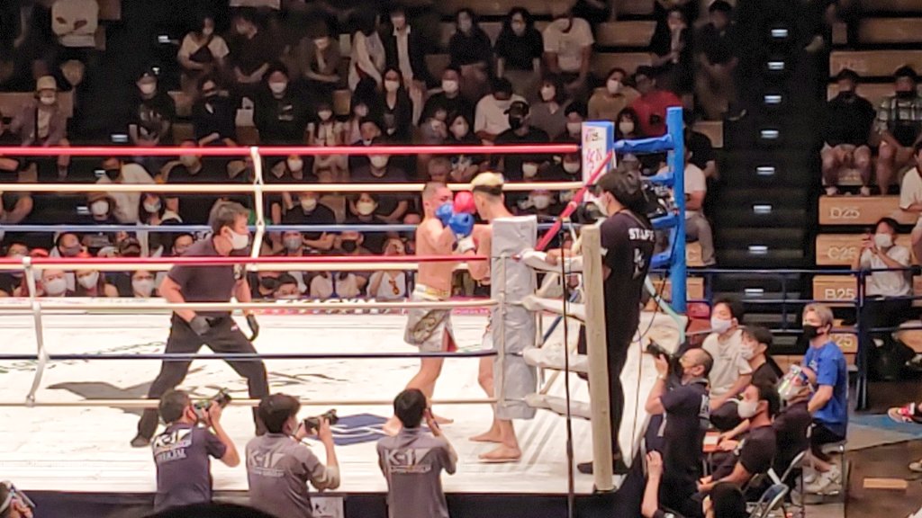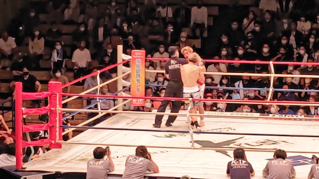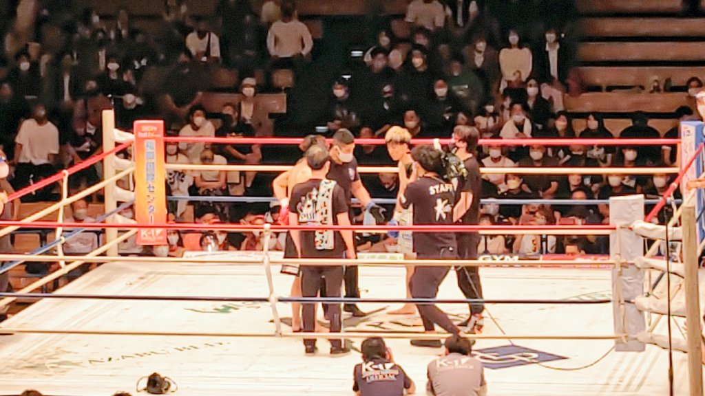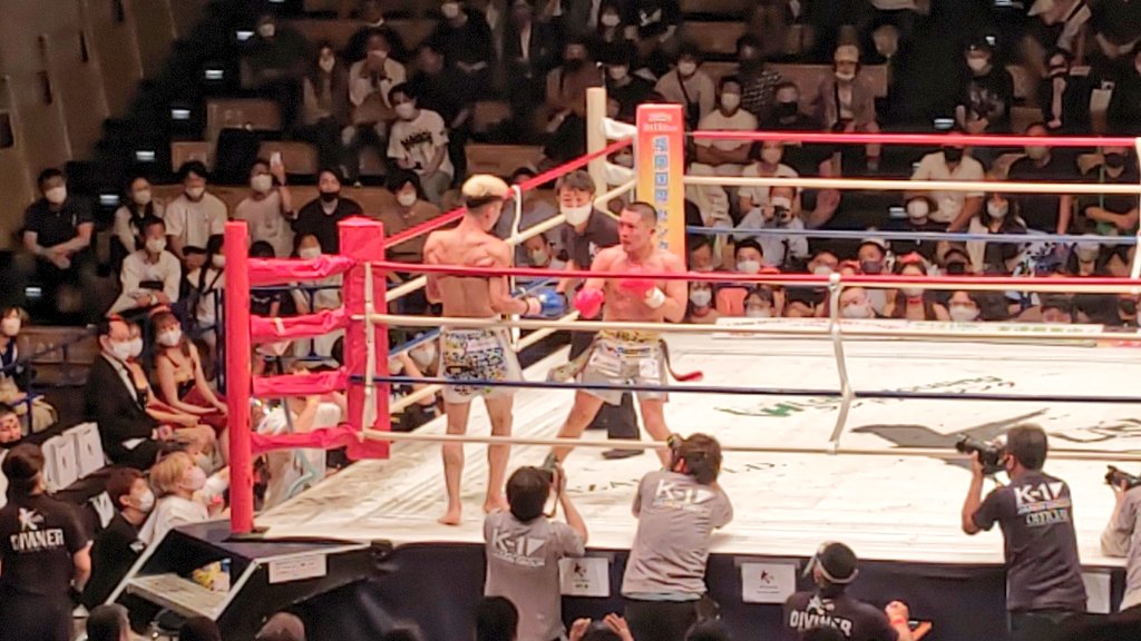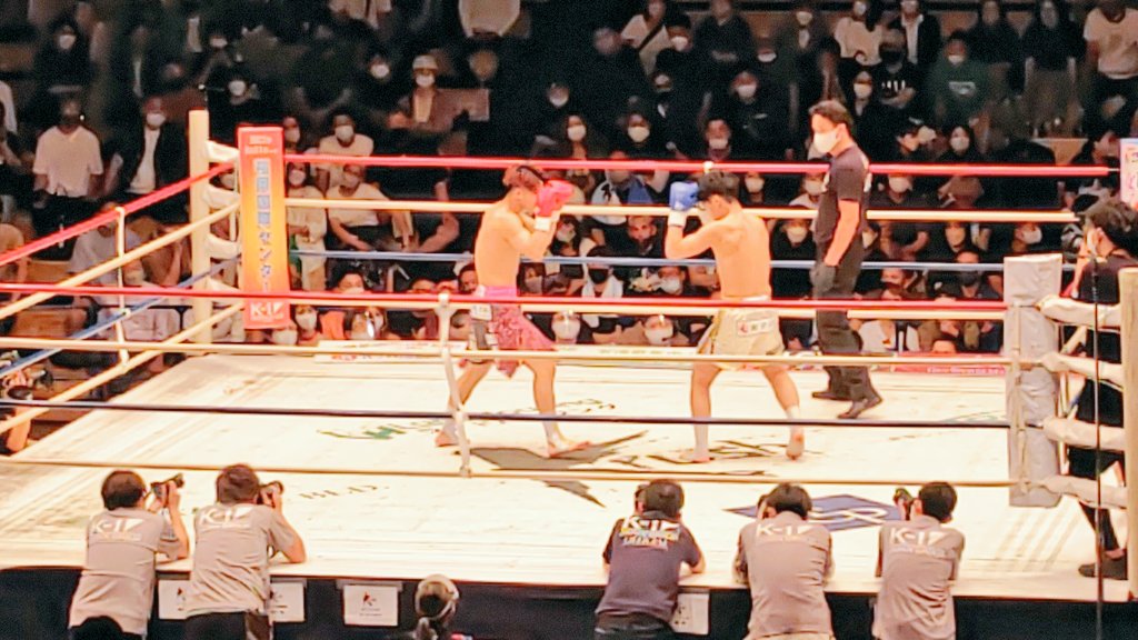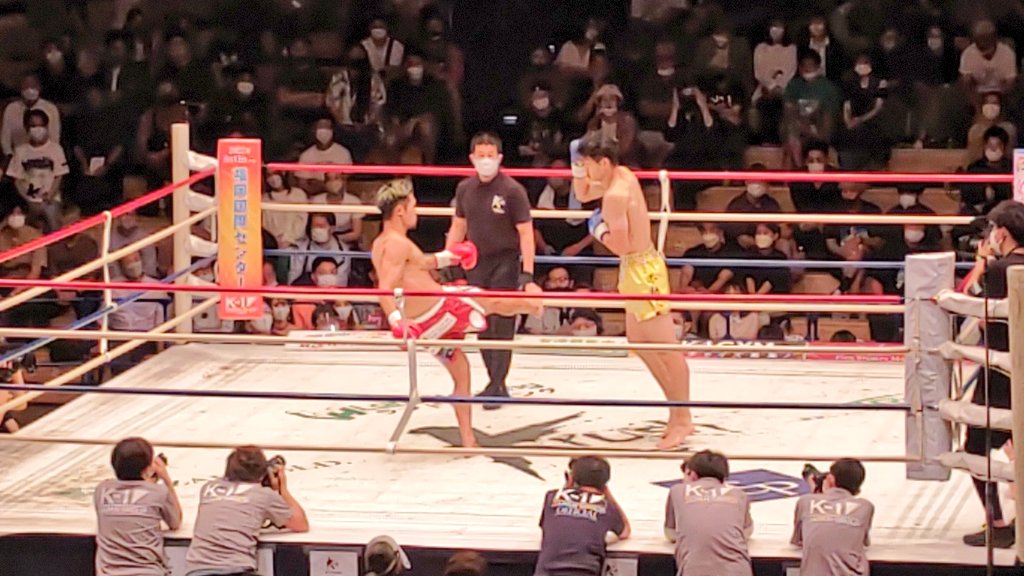 Krush第八試合Sフェザー級3分3R+延長3分1R、PURGE TOKYOの野田哲司vs team ALL-WINの松本涼雅。共に前戦で敗れてからの再起戦、1R、小刻みにリズムを刻みプレッシャーを掛ける野田、ベタ足で迎え撃つ松本。見合う場面が多い中、野田は前に出てワンツーと右ローを放ち、松本はそこへ左フックを被せる。