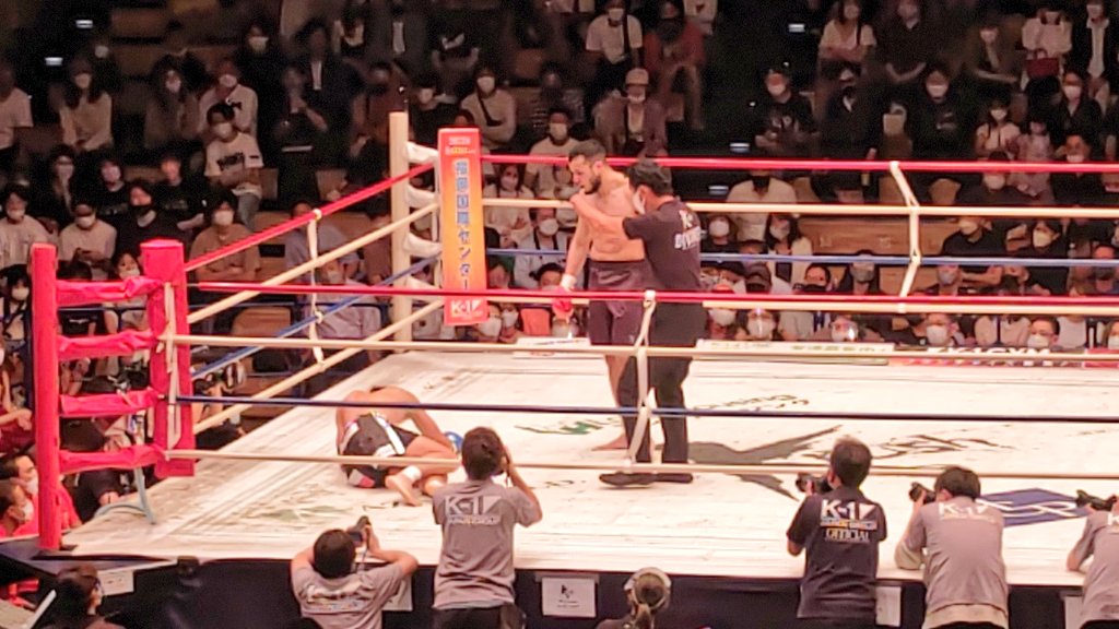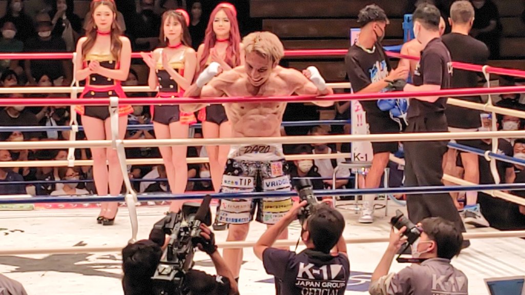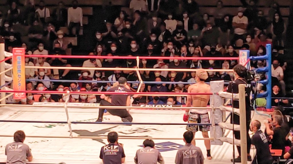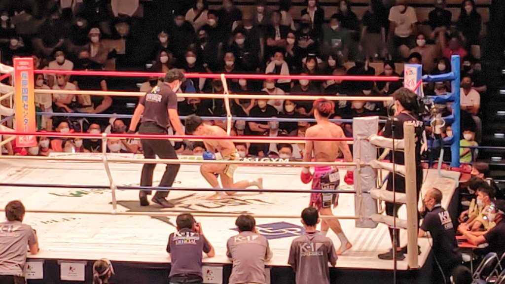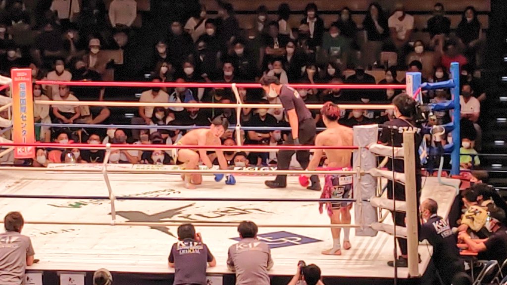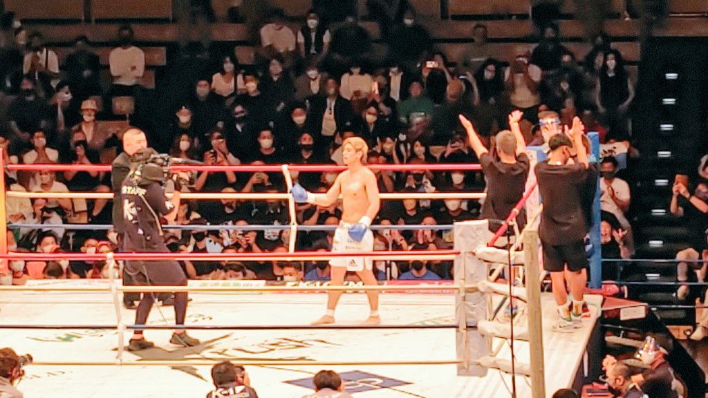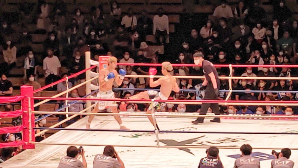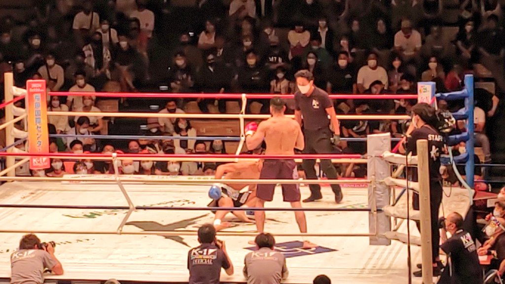 Krush第八試合Sフェザー級3分3R+延長3分1R、PURGE TOKYOの野田哲司vs team ALL-WINの松本涼雅。共に前戦で敗れてからの再起戦、1R、小刻みにリズムを刻みプレッシャーを掛ける野田、ベタ足で迎え撃つ松本。見合う場面が多い中、野田は前に出てワンツーと右ローを放ち、松本はそこへ左フックを被せる。
