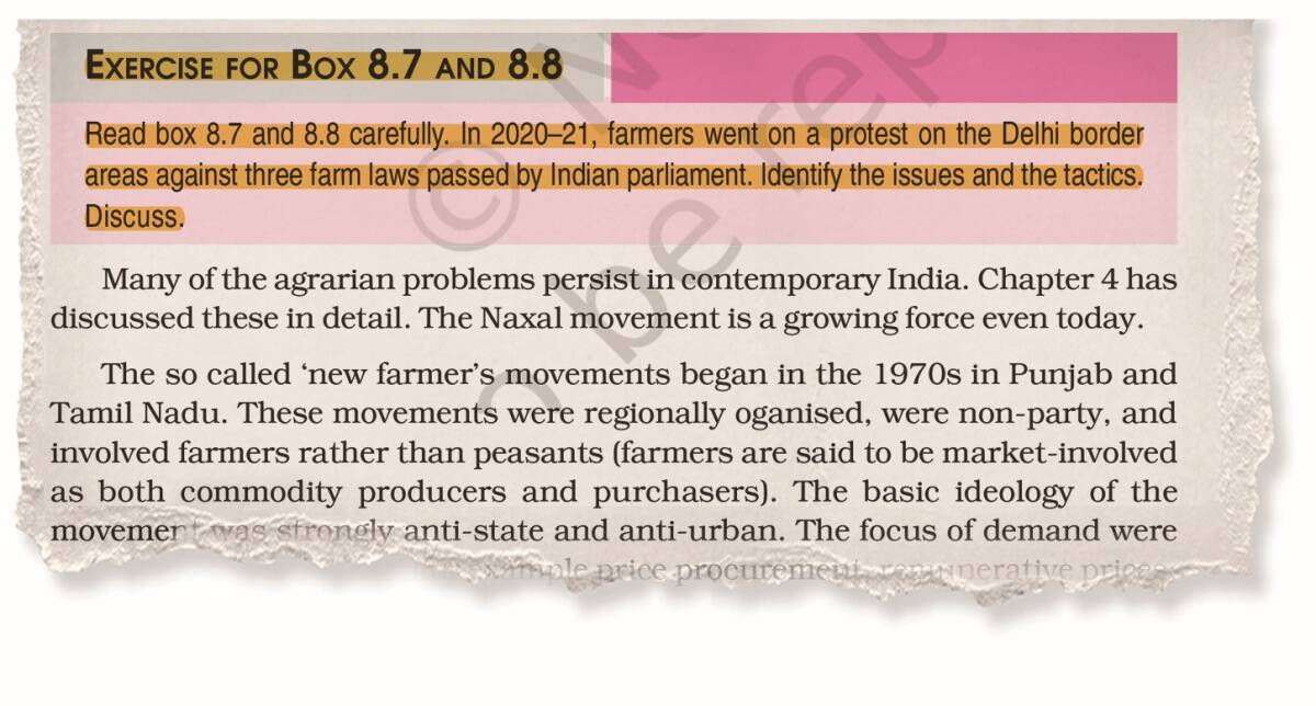 👉Among other deletions on protests & social movements is an 'exercise box' (in the Class 12 sociology textbook) that asks students to discuss the recent farmers’ protests against the three farm laws passed by the Parliament.