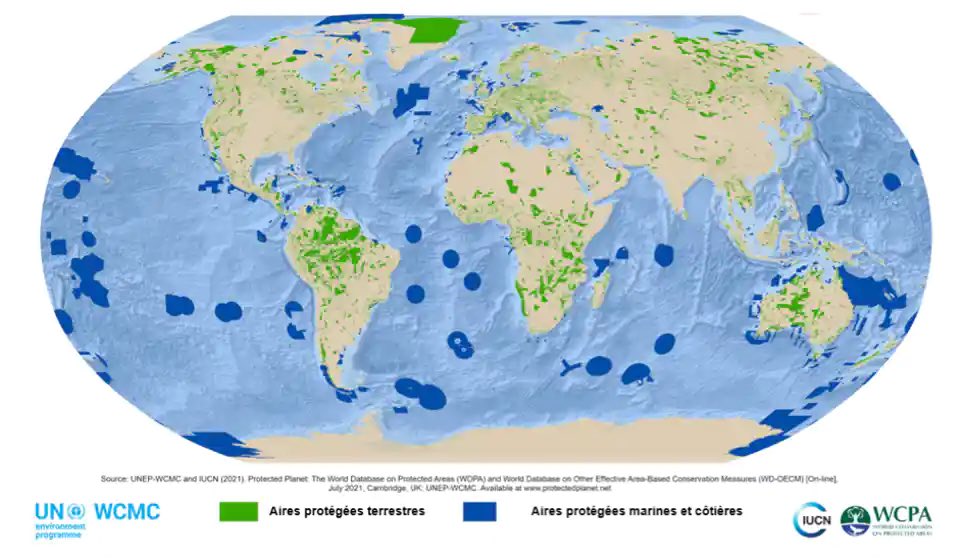 Les aires protégées couvrent déjà 15,73% de la surface terrestre. Les pays du Sud représentent 66% de cette couverture. Certains pays africains réservent 30% voire 40% de leurs territoires nationaux exclusivement à la protection de la biodiversité, contre 12% aux États-Unis.