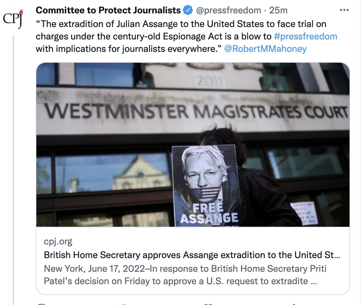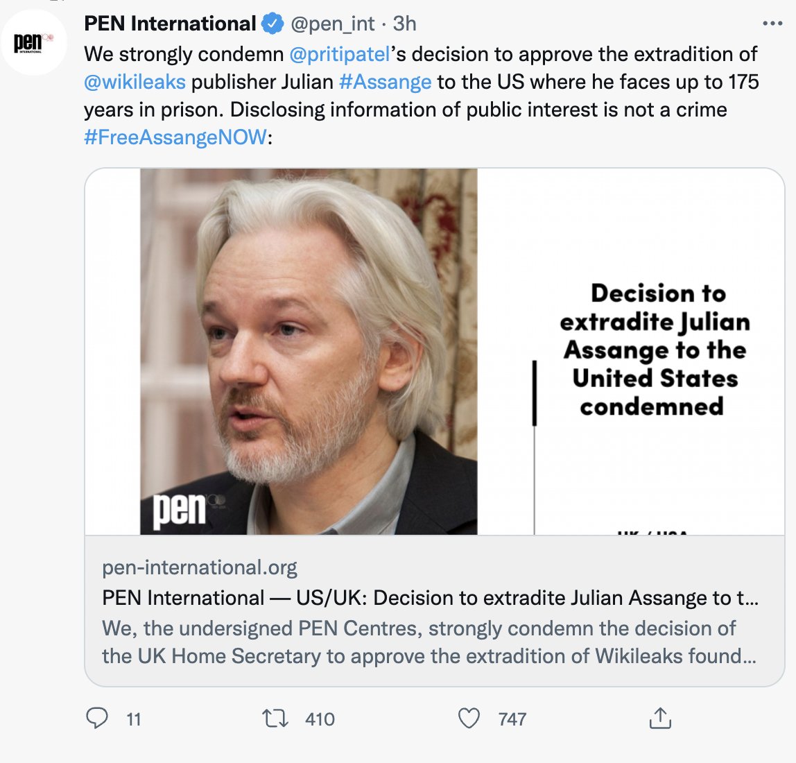 And again, every major press freedom, human rights and civil liberties group in the US/UK are echoing exactly what MTG said about this Assange persecution. The utter silence of major left-liberal figures in the US is nothing short of disgraceful (as unsurprising as it is).