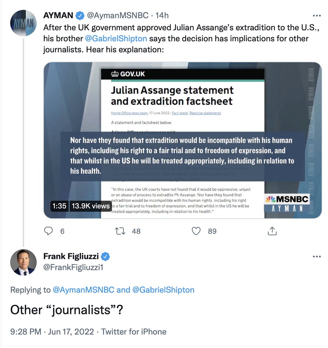 Now that NBC and CNN are filled with ex US Security State operatives on the payroll, goons like former FBI Asst. Dir. @FrankFigliuzzi1 (now of NBC) attack colleague @AymanM for calling Assange a journalist. Assange never even worked for CIA/NSA/DOJ: how he can be a journalist??