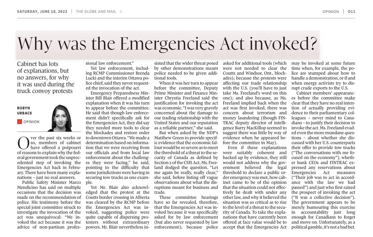 🧵To read the histrionics being promulgated by the likes of @RobynUrback, you’d think the declaration of a public order emergency in February involved tanks in the streets, rubber bullets if not worse, and mass arrests and detention. Let’s give our heads a shake: the vast …