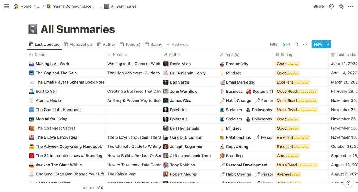 Within that database, I can filter my summaries by "Rating," sort by “Last Updated,” search by keyword, and more. Image